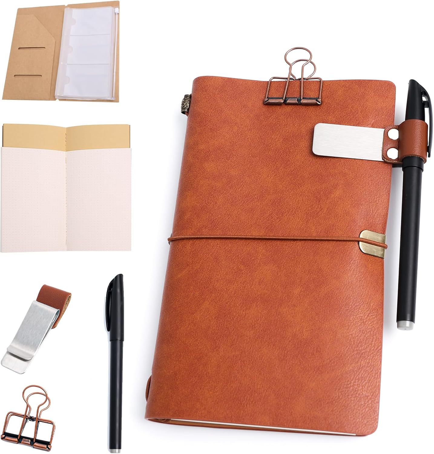 Refillable Journal Travelers Notebook – 7.8 x 4.7 Travel Diary made of PU leather, with 5 Inserts, add 2 Pens and pen Holder and Binder Clip and Transparent Card insertion bag with storage case (1 set)