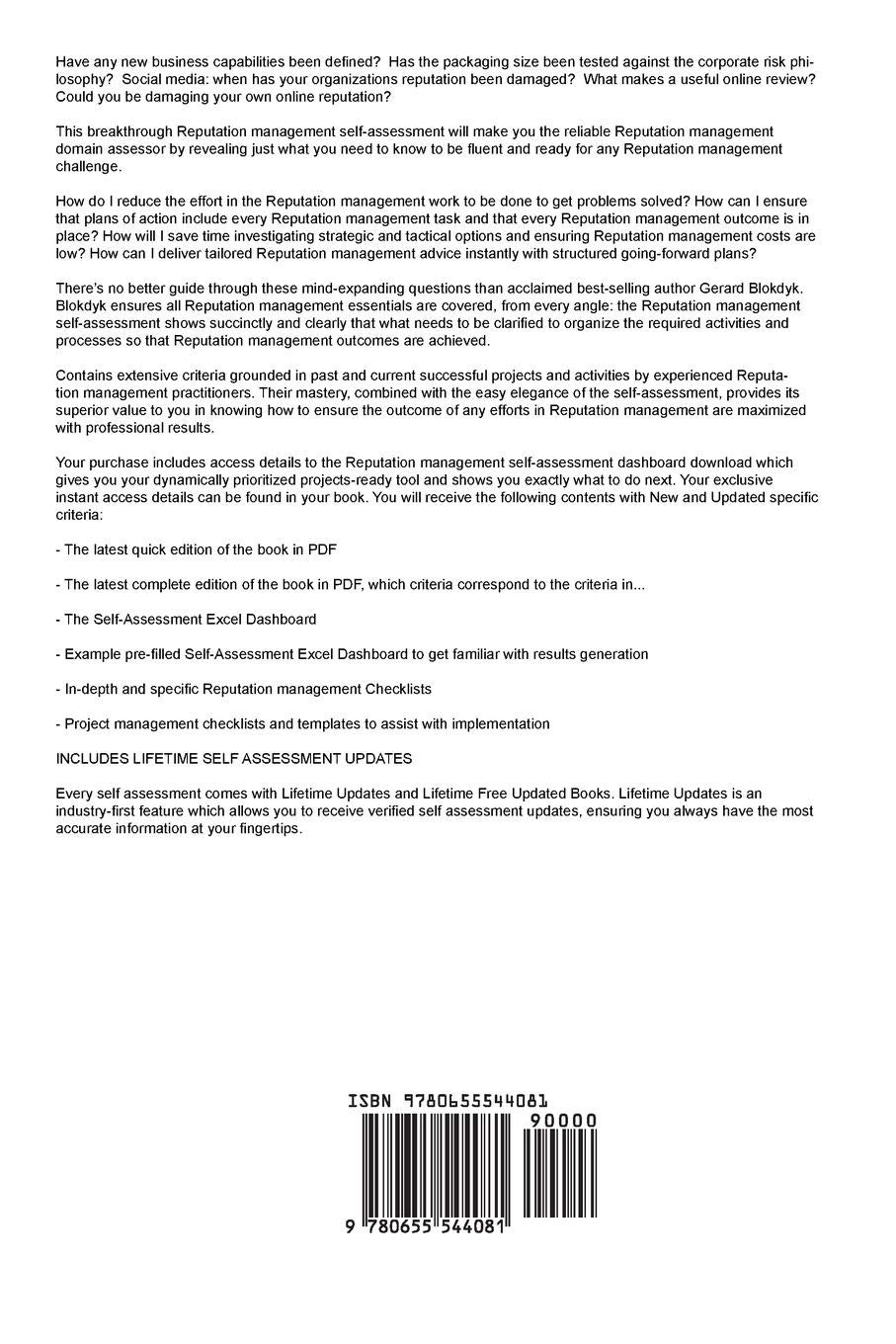 INCLUDES all the tools you need to an in-depth Reputation Management Self-Assessment. Featuring new and updated case-based questions, organized into seven core levels of Reputation Management maturity, this Self-Assessment will help you identify areas in which Reputation Management improvements can be made.