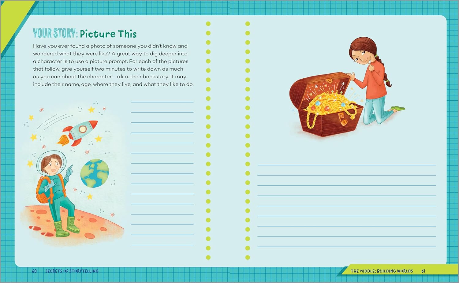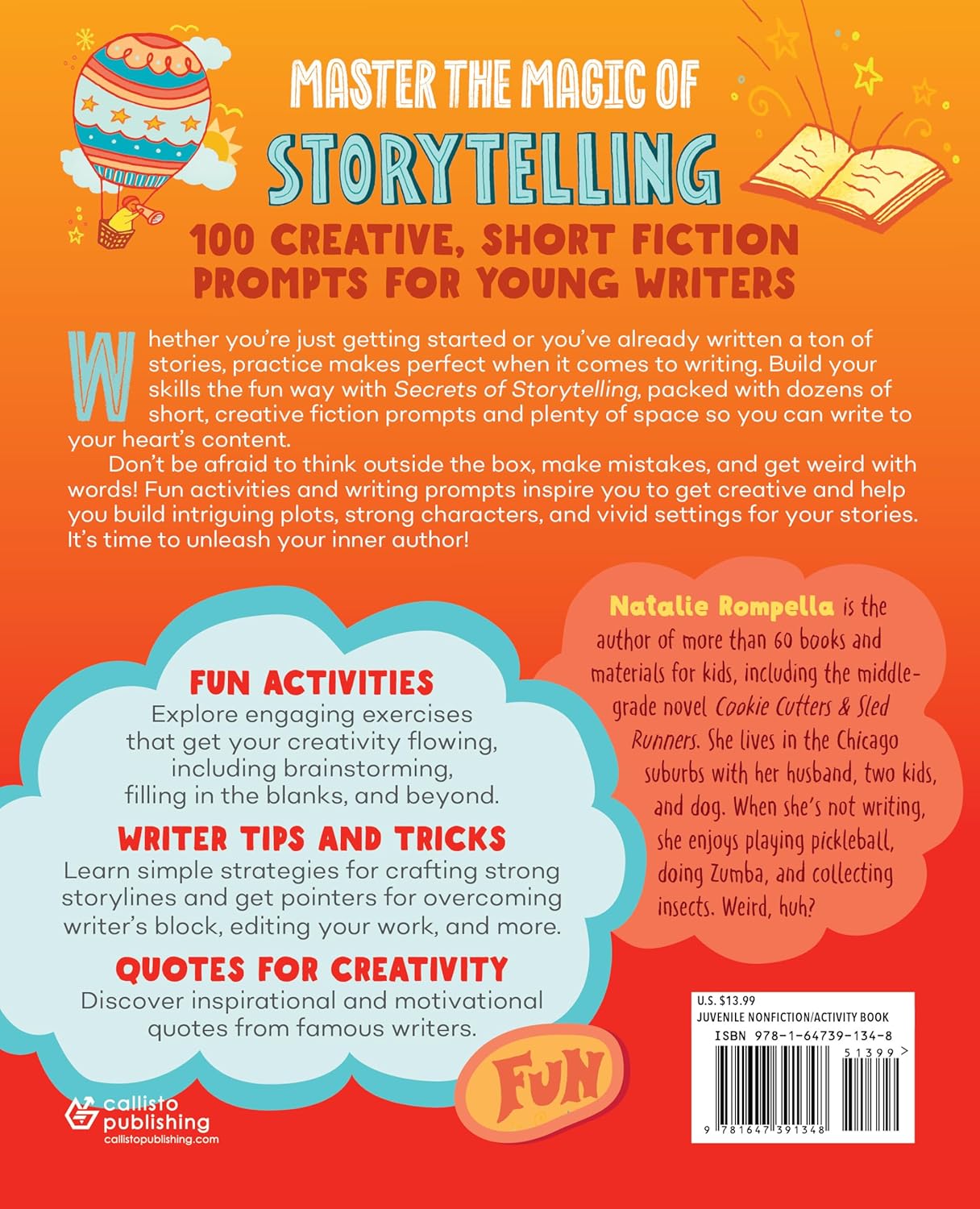 Short lessons on plot, character, and setting embedded within activitiesMotivational quotes from real authors to encourage young voicesA write-in format with built-in brainstorming and drafting space100 engaging prompts across fantasy, mystery, humor, and more