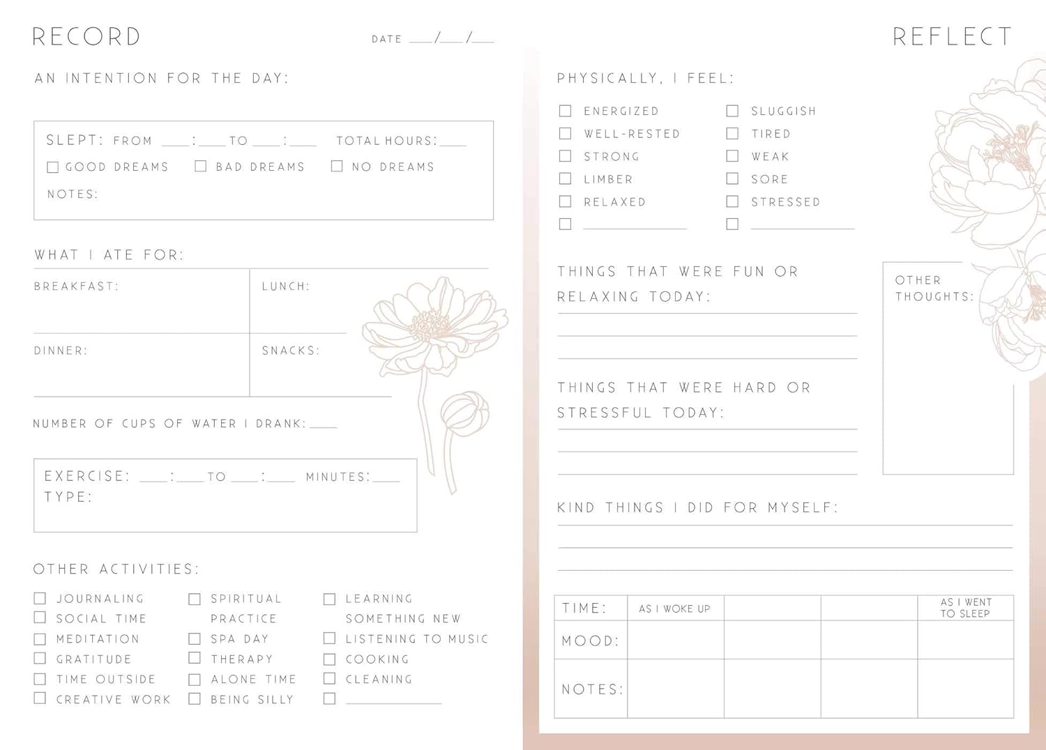 Customers find this self-care journal beautiful and appreciate its nice layout with a good balance of structure. The journal is easy to use and serves as a great tool for self-awareness, with one customer noting how it helps track daily activities and another mentioning its usefulness in doctor’s appointments. They like the writing prompts, with one noting there are plenty of spaces to write, and find it helpful for mood tracking and dealing with mental health.