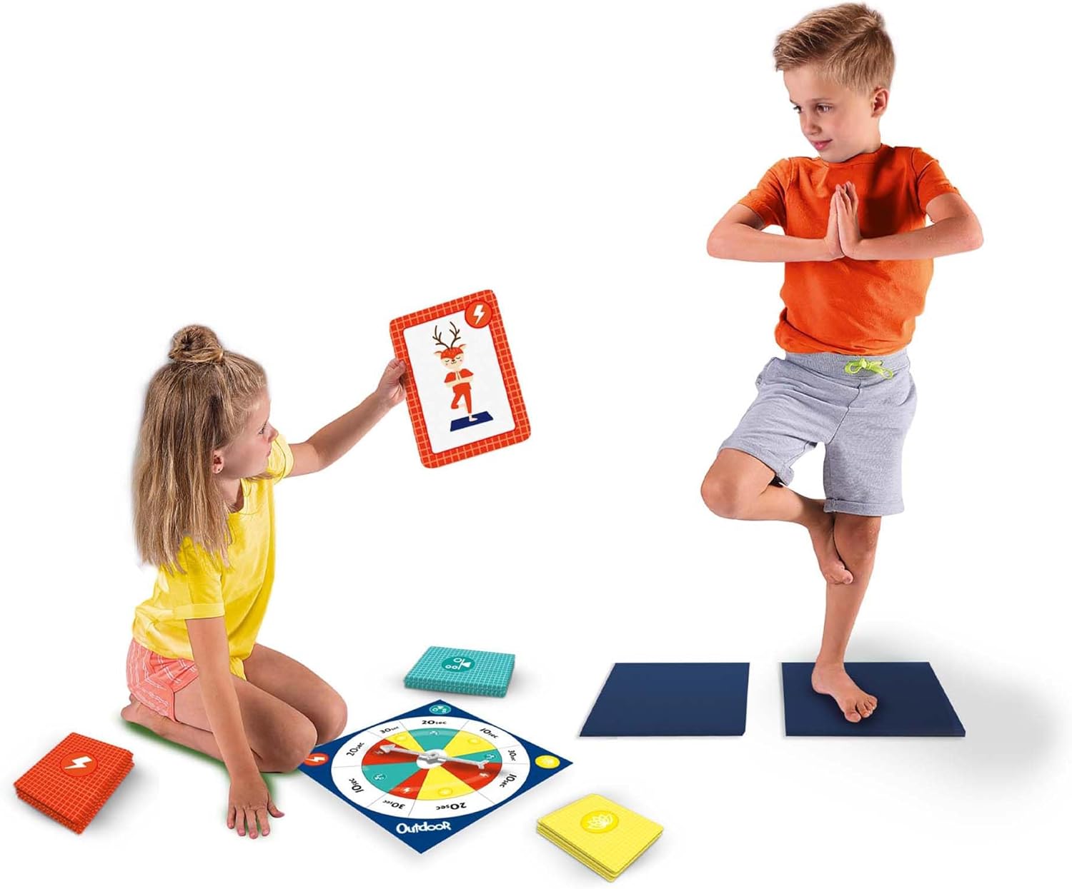 COMPLETE YOGA SET: Includes 2 yoga mats, a spinner board, and 27 yoga cards, providing everything needed for fun, guided play. Use indoor and outdoor!