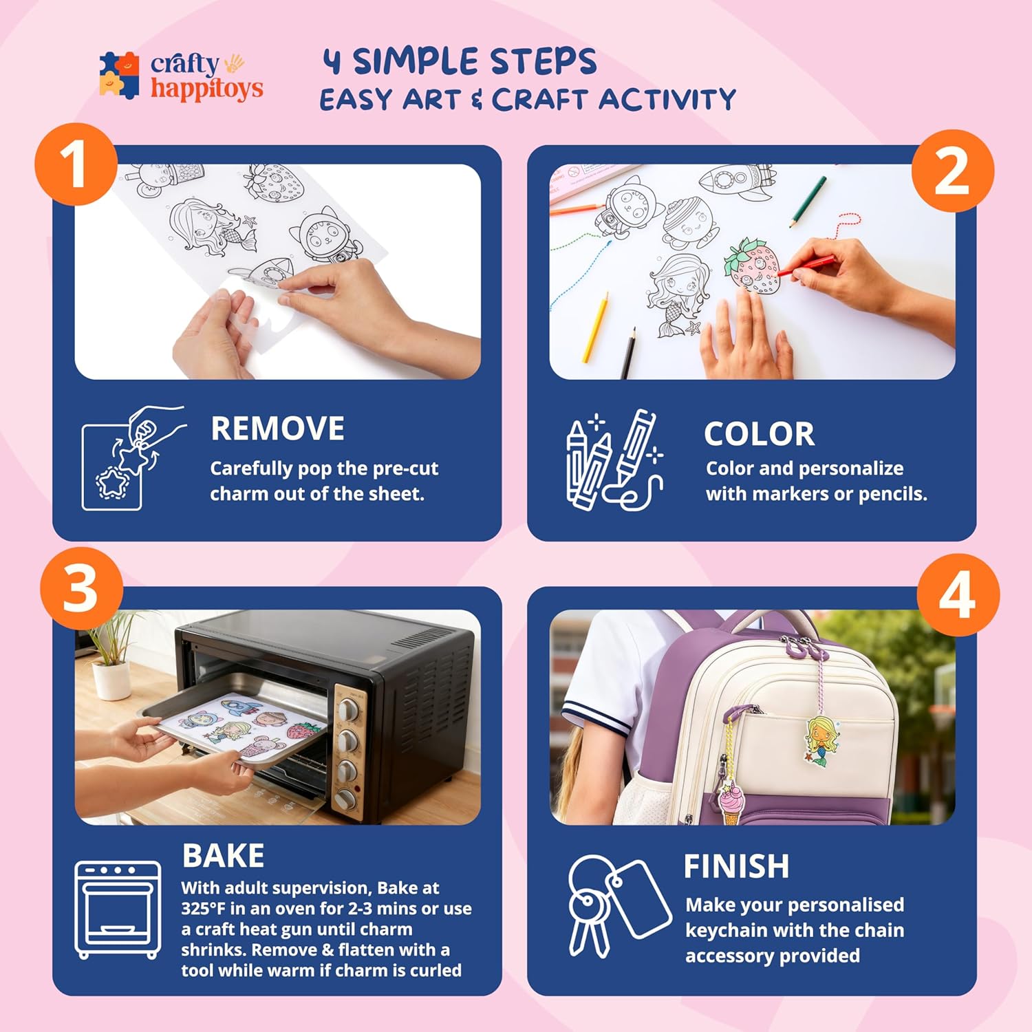 4-Step Shrink Magic — Peel pre-cut cute character charms, color them, then bake 1–3 minutes at 325°F with adult’s help and watch them shrink to 1/4 of the original size. Quick, mess-free projects for home, teachers, and party craft stations.