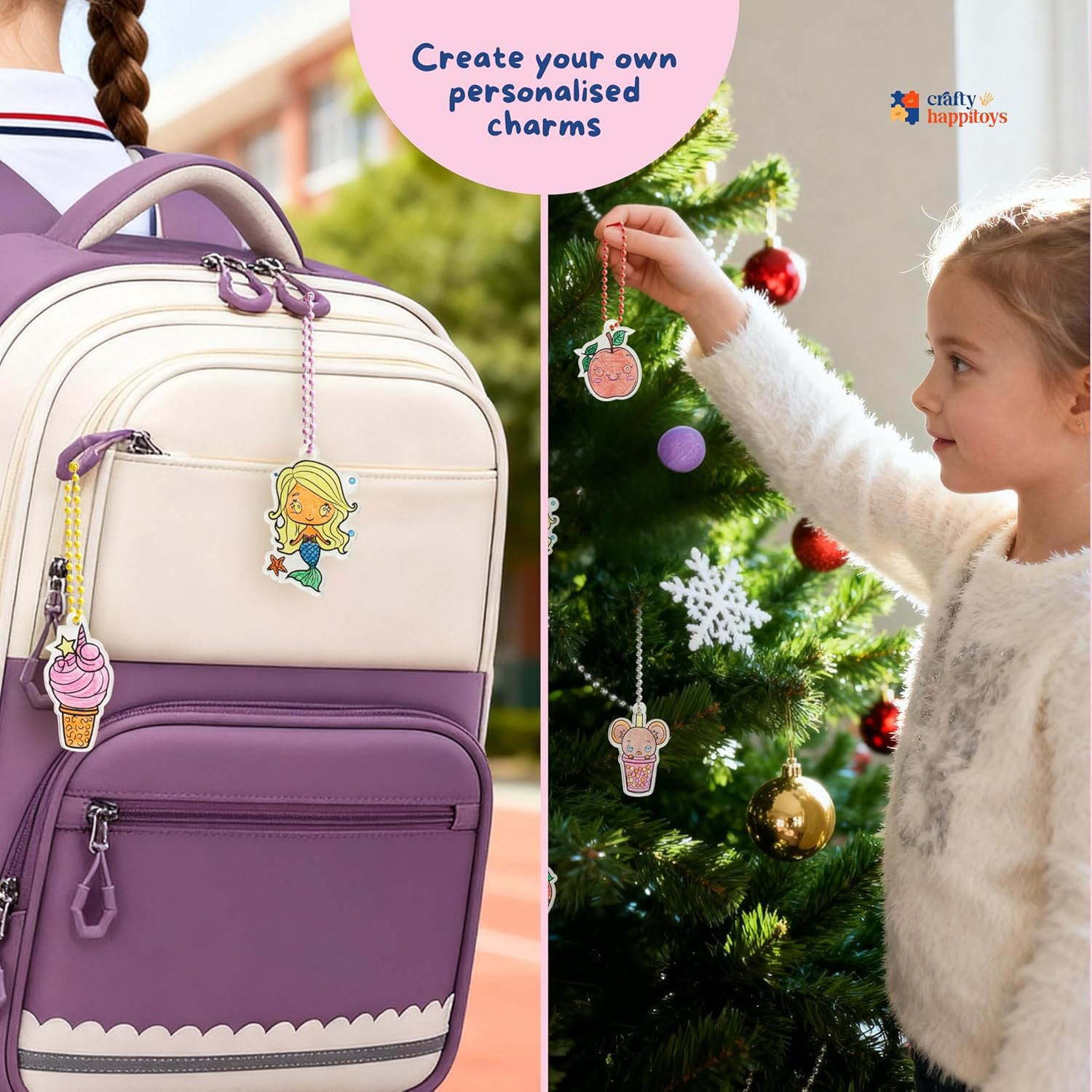 All Included Kit – Make 30 custom charms with 30 pre-cut shrink plastic designs, 30 loop keychains, 10 colored pencils and easy step guide. No cutting, no extras needed. Perfect kids craft kit activity for kids ages 6+, screen-free fun with Magic Shrinkies