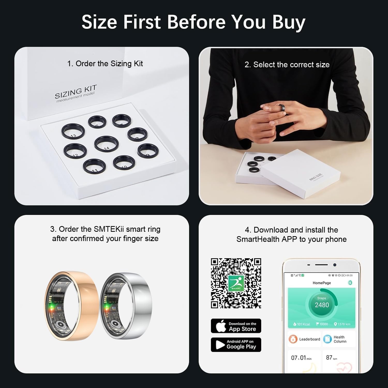 【Size Before You Buy】The SMTEKii Smart Ring follows US ring sizing standards. If you know your US ring size, simply order the same size for a perfect fit. If you’re unsure of your size, we recommend getting our Sizing Kit to find your comfort size.