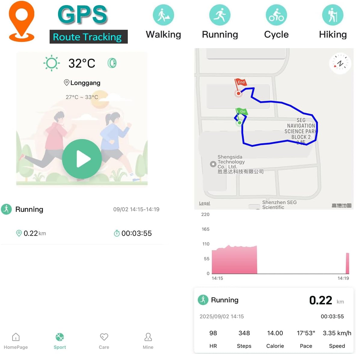 【Fitness Tracker & GPS Route】The Smart Health Ring tracks your your steps, distance walked and calories burned with high precision. And it works with GPS map on APP which can check your walking / Running/ Cycle/ Hiking route.