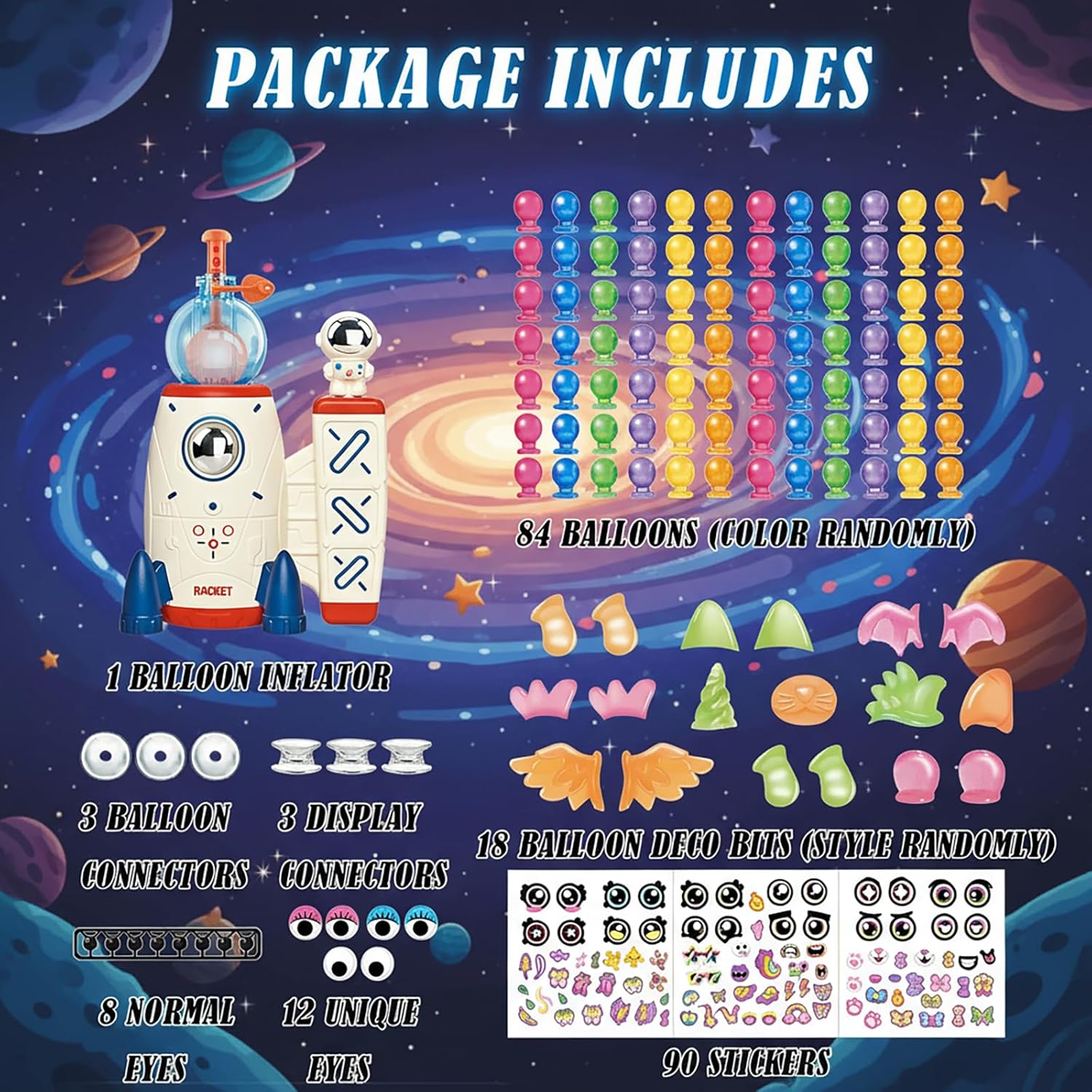 Complete Balloons Kit Set: Includes 84 colorful balloons—more than others—as well as themed stickers and decorative accessories, allowing children to design unique balloon animals, monsters, or space creatures. No extra tools are required. Note: Insert the safety key after placing the balloon, connect the inflation device, and then remove it