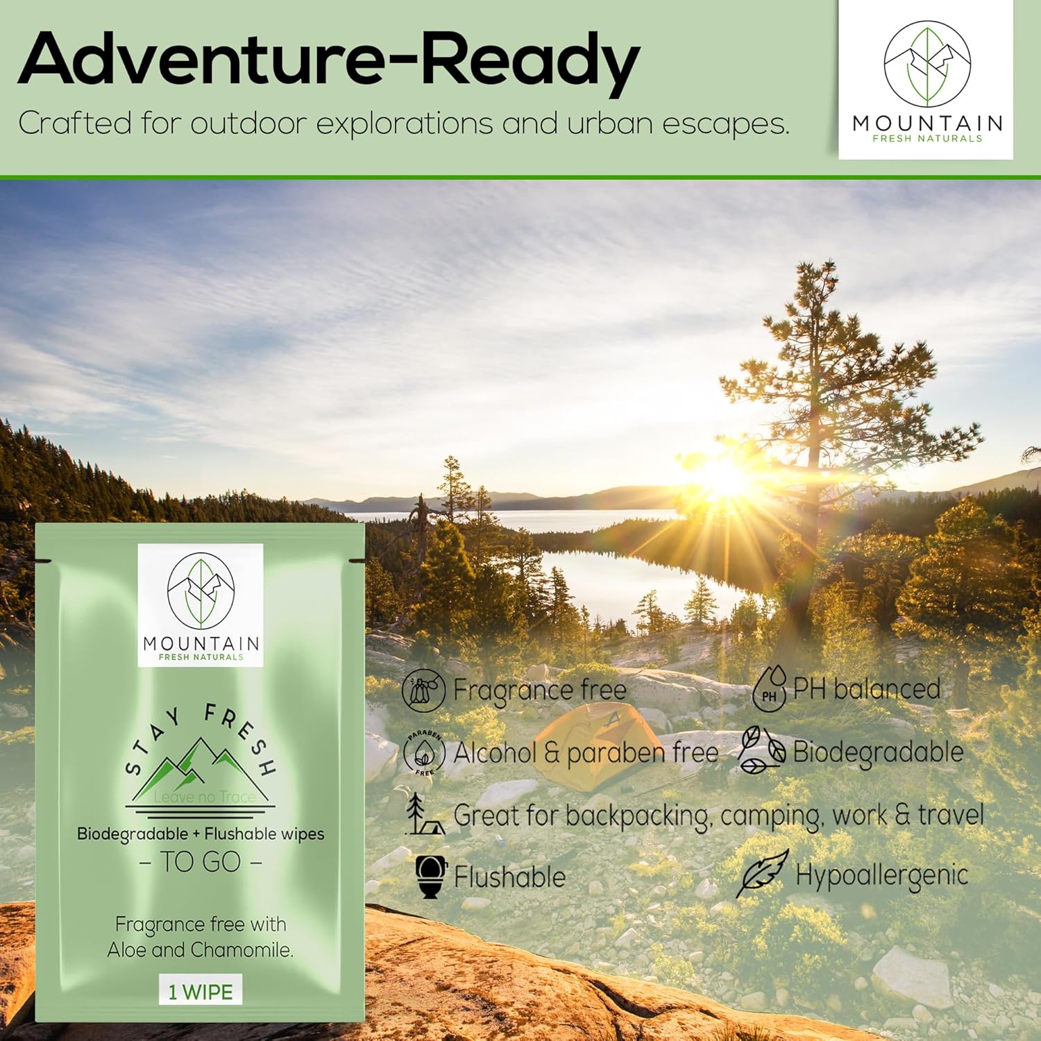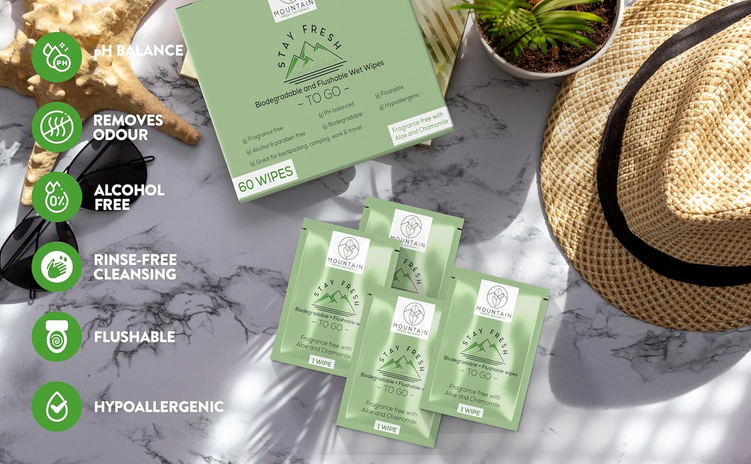 STAY FRESH (60 Flushable Wipes to-Go) – PH Balanced, Travel sized, Unscented with Aloe, Chamomile and Rose extract.