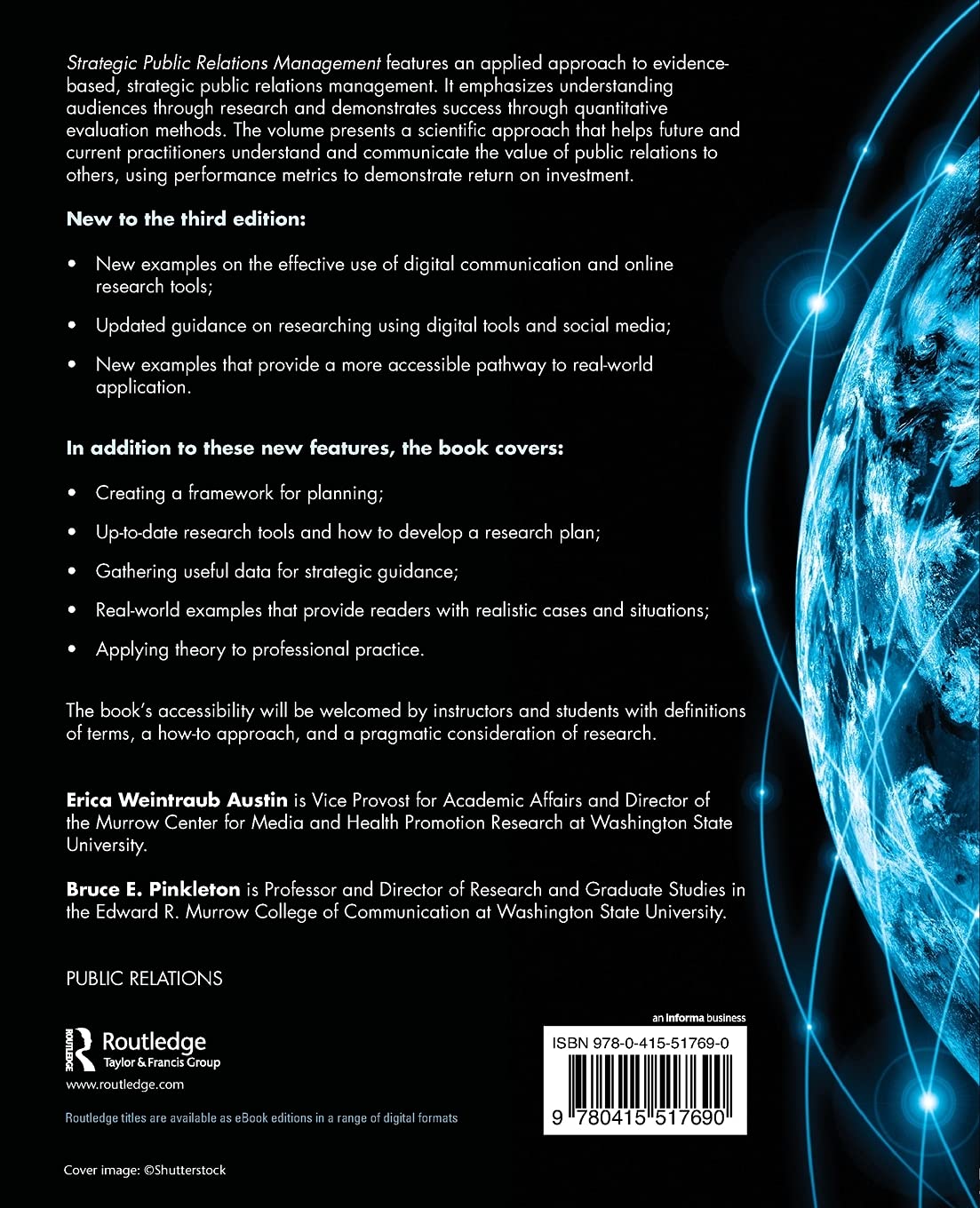 Strategic Public Relations Management features an applied approach to evidence-based, strategic public relations management. It emphasizes understanding audiences through research and demonstrates success through quantitative evaluation methods. The volume presents a scientific approach that helps future and current practitioners understand and communicate the value of public relations to others, using performance metrics to demonstrate return on investment.