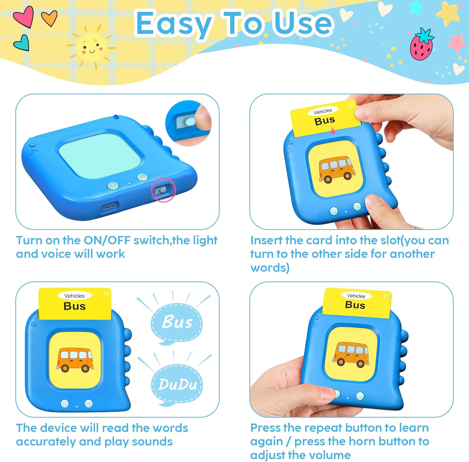Fun Learning: The Kuovei talking flash card educational toy covers subjects like animals, transports, food, fruits, vegetables, costumes, nature, persons, profession, shapes and so on. It enhances cognitive ability, exercises hearing and builds vocabulary for kids.