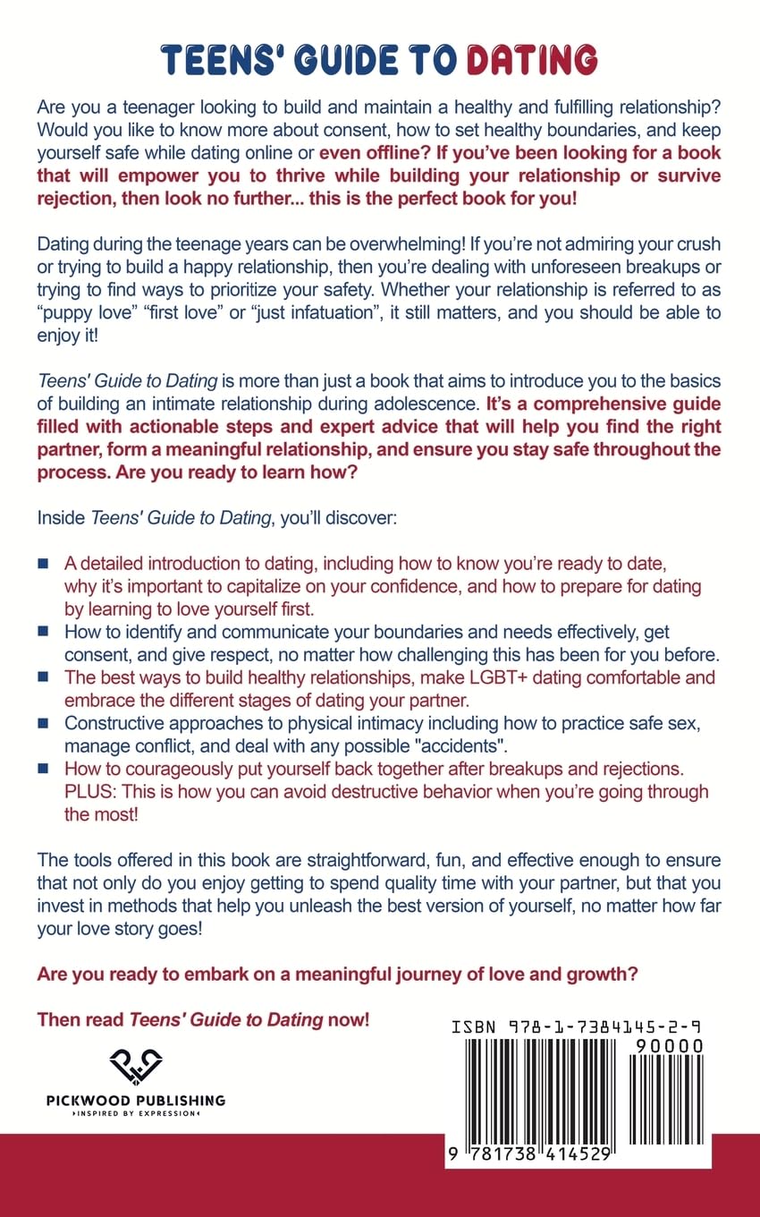 Inside Teens’ Guide to Dating, you’ll discover:A detailed introduction to dating, including how to know you’re ready to date, and how to prepare for dating by learning to love yourself first.How to identify and communicate your boundaries and needs effectively, get consent, and give respect, no matter how challenging this has been for you before.The best ways to build healthy relationships, make LGBT+ dating comfortable and embrace the different stages of dating your partner.Constructive approaches to physical intimacy including how to practice safe sex, manage conflict, and deal with any possible “accidents”.How to courageously put yourself back together after breakups and rejections. PLUS: This is how you can avoid destructive conduct when you’re going through the most!The tools offered in this book are straightforward, fun, and effective enough to ensure that not only do you enjoy getting to spend quality time with your partner, but that you invest in methods that help you unleash the best version of yourself, no matter how far your love story goes!