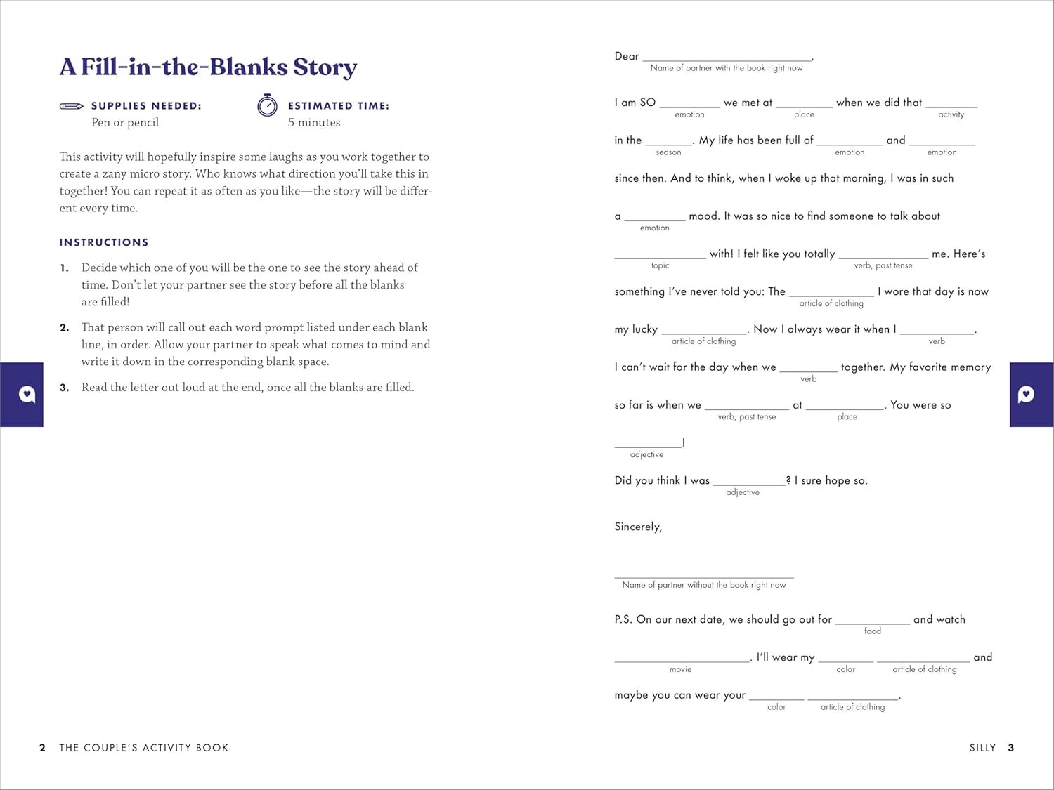 The games in The Couple’s Activity Book range from fun fill-in-the-blanks and word scrambles to more involved activities, like themed date nights, DIY day spas, and becoming tourists in your own hometown. Some can be done spontaneously. Others need a little preparation for a truly special experience. Unlike other relationship books for couples, the activities are designed to be carefree and entertaining without the added pressure of journaling or deep reflections.