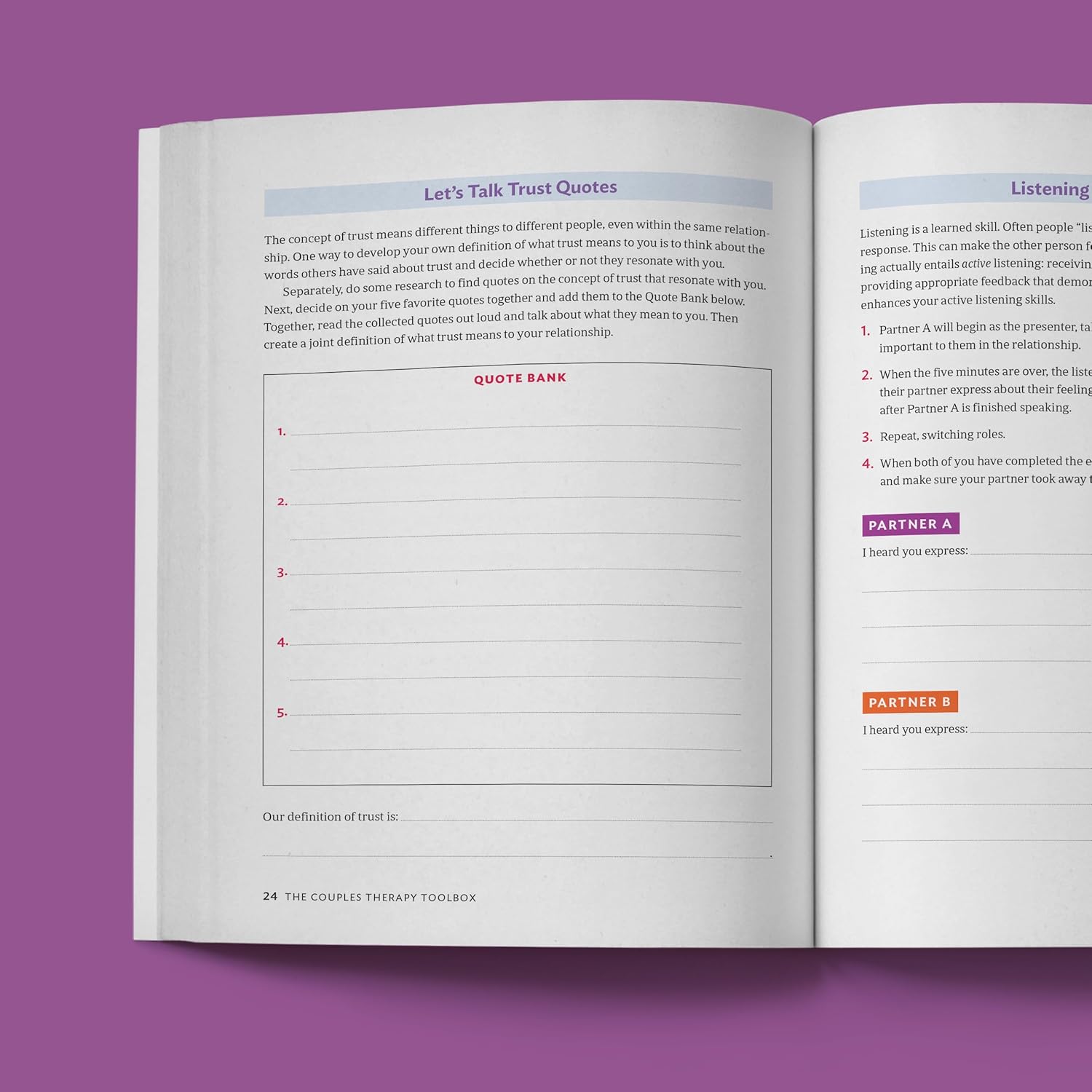 Building a deep and lasting connection as a couple takes skills and practice. This couples therapy workbook has more than 75 evidence-based exercises and strategies to help you learn to communicate, develop trust, handle conflict, nurture intimacy, and foster a more equal, satisfying partnership―together.