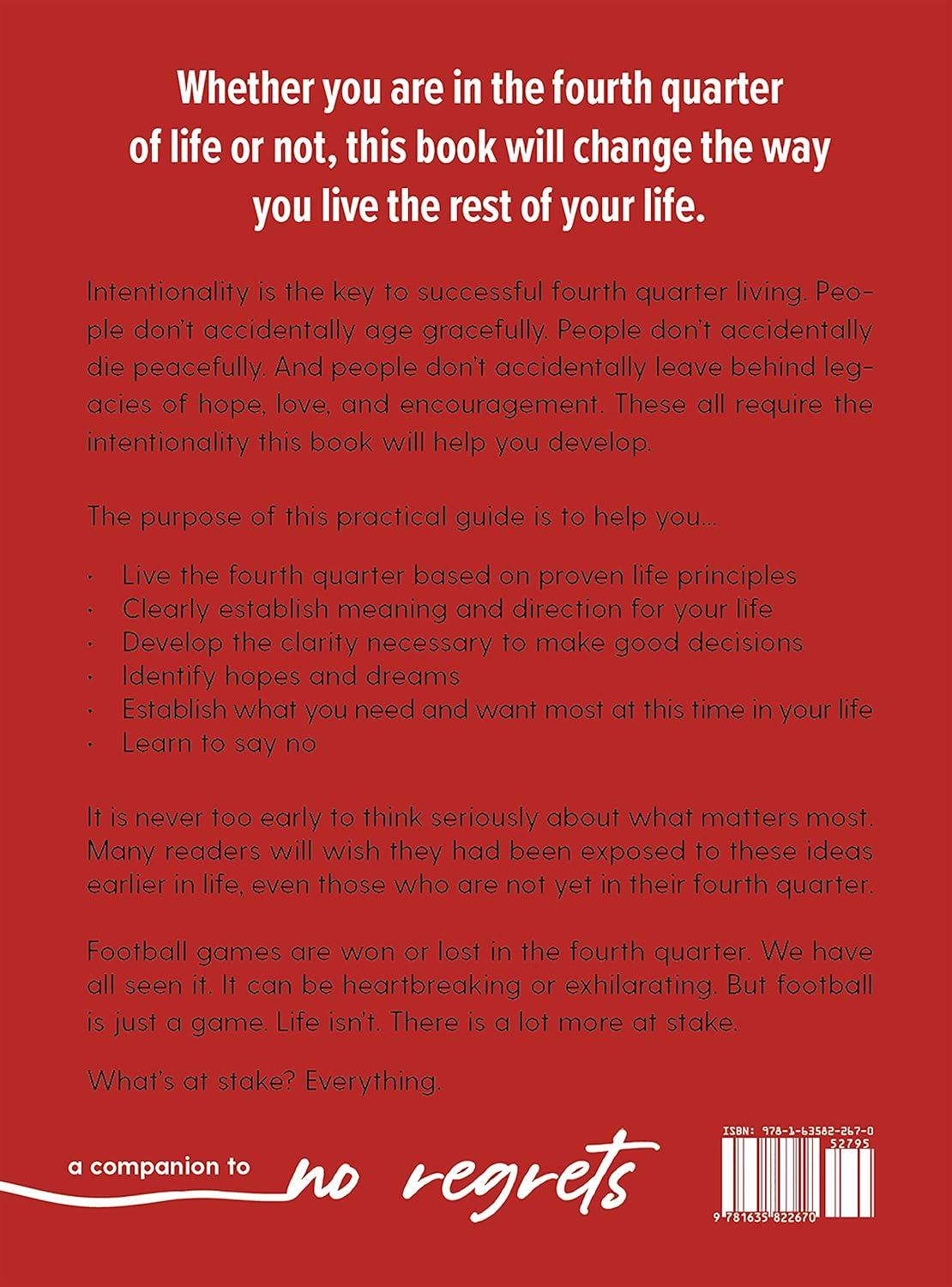 Live the fourth quarter based on proven life principlesClearly establish meaning and direction for your lifeDevelop the clarity necessary to make good decisionsIdentify hopes and dreamsEstablish what you need and want most at this time in your lifeLearn to say no It is never too early to think seriously about what matters most. Many readers will wish they had been exposed to these ideas earlier in life, even those who are not yet in their fourth quarter.