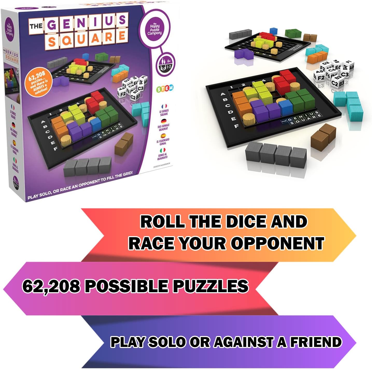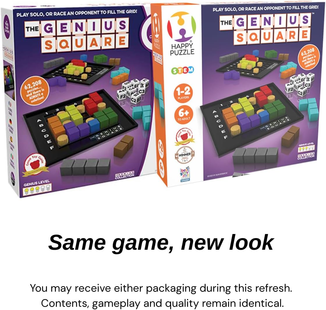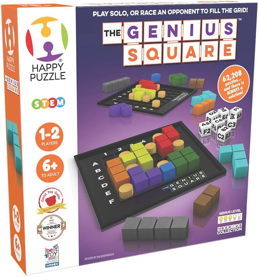 The Genius Square from The Happy Puzzle Company – Game of The Year Award Winner, 60000+ Solutions STEM Puzzle Game. Roll Dice, Race Your Opponent to Fill Grid with Different Shapes!