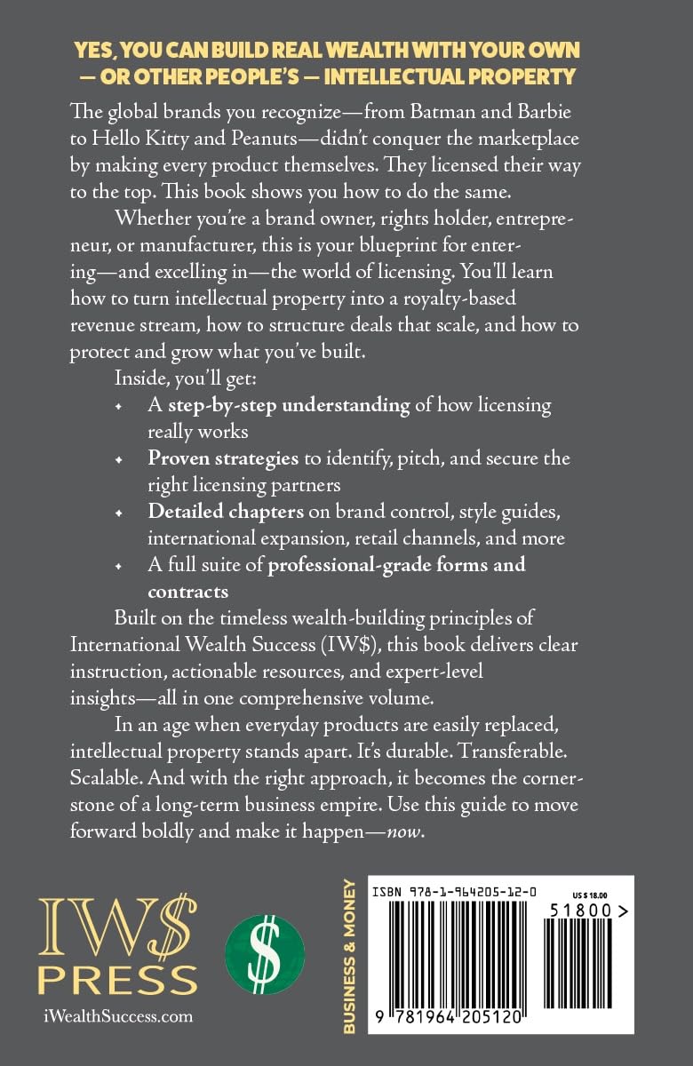 Turn Intellectual Property Into Income, Influence, and Expansion The world’s biggest brands—Batman, Barbie, Hello Kitty, Peanuts—didn’t reach global fame by producing everything themselves. They licensed their intellectual property to partners who created thousands of products, earned billions in royalties, and extended their reach into every corner of the market. You can do the same. The IWS Guide to Product Licensing Success gives you the complete blueprint for building a licensing business from scratch—or adding a powerful new revenue stream to your existing brand, product, or entrepreneurial venture. Build a Scalable, High-Profit Business Without Heavy Overhead Whether you’re a creator, rights holder, business owner, or opportunity seeker, this guide will show you how to use licensing to scale without manufacturing, warehouse costs, or capital risk. Inside, You’ll Discover:How licensing works and why it’s the hidden engine behind many billion-dollar brandsWhat licensors and licensees look for in a profitable partnershipWhere to find ideal partners, manufacturers, and product developersHow to present a licensing pitch that commands attention and closes dealsWays to expand internationally using intellectual property as leverageHow to negotiate royalties, track compliance, and enforce brand integrityModern tools for managing and scaling your licensing operationIncludes All the Contracts, Templates, and Licensing Forms You’ll Need You’ll get a complete package of professional-grade documents—from licensing agreements to reporting templates, deal memos, and brand style guide outlines. Use them to jump-start your business or professionalize your existing licensing efforts. Use This Book To:Launch your own licensing program—step by stepLicense your brand, artwork, invention, or productAcquire and monetize intellectual property profitablyExpand your product offerings through brand partnershipsCreate ongoing royalty income from assets you already ownBuild a wealth-generating business that scales with legal contracts, not inventoryFor Entrepreneurs, Creators, and Business Builders Ready for the Next Level Whether you’re launching your first venture or expanding an existing brand, this book gives you the framework, tools, and business acumen to succeed. You’ll learn how to think like a licensing executive—and act like a seasoned wealth builder. About the AuthorTyler G. Hicks is the Legendary Sage of Success and the founder of International Wealth Success (IW$), the trusted business publishing house that has guided millions of readers for over five decades. He is the author of dozens of bestselling books on real estate, business, finance, and personal wealth building—including How to Get Rich on Other People’s Money and How to Leverage Your Way to a Great Fortune.