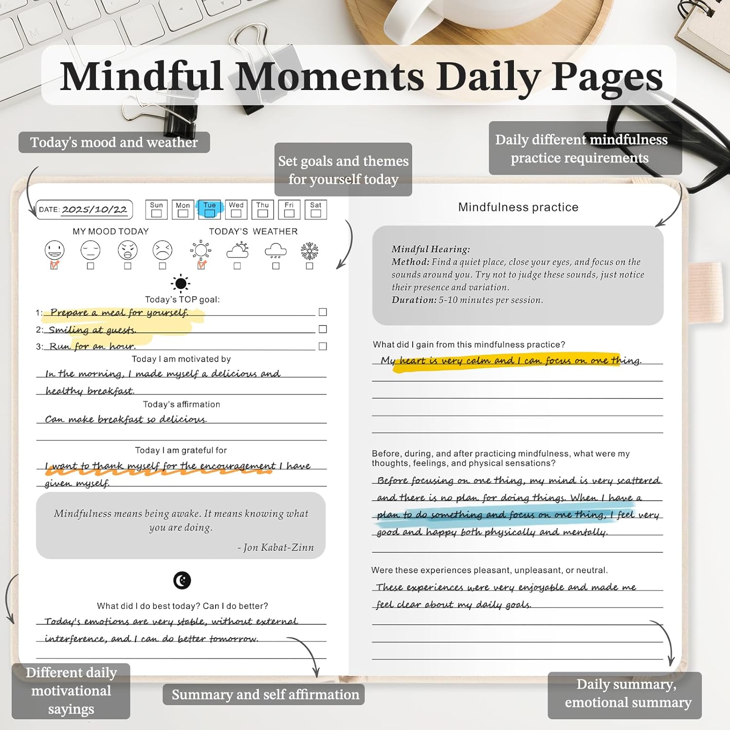 EFFECTIVE MINDFUL JOURNAL: This mindfulness journal contains daily weather and mood, sets daily goals for yourself, and has different motivational sayings for each day. It allows you to summarize and affirm yourself daily, enabling you to focus on your mindfulness. Monthly goals and monthly summaries provide a very powerful and effective method to help you practice and achieve your goals.