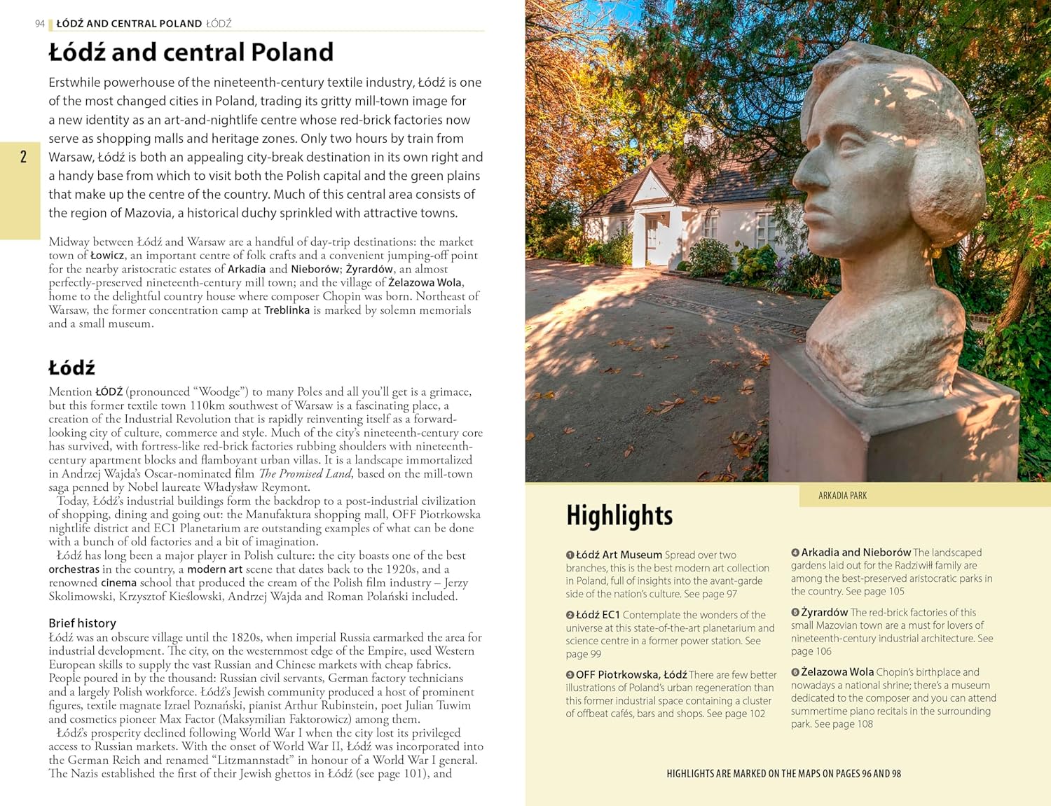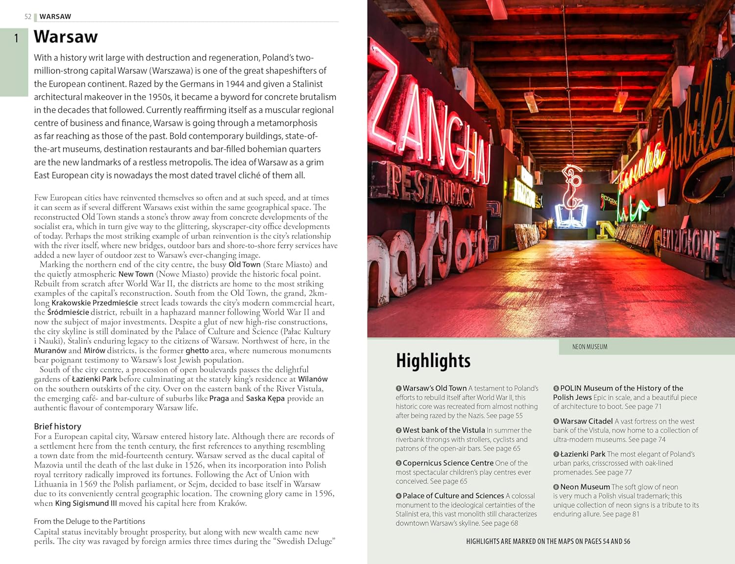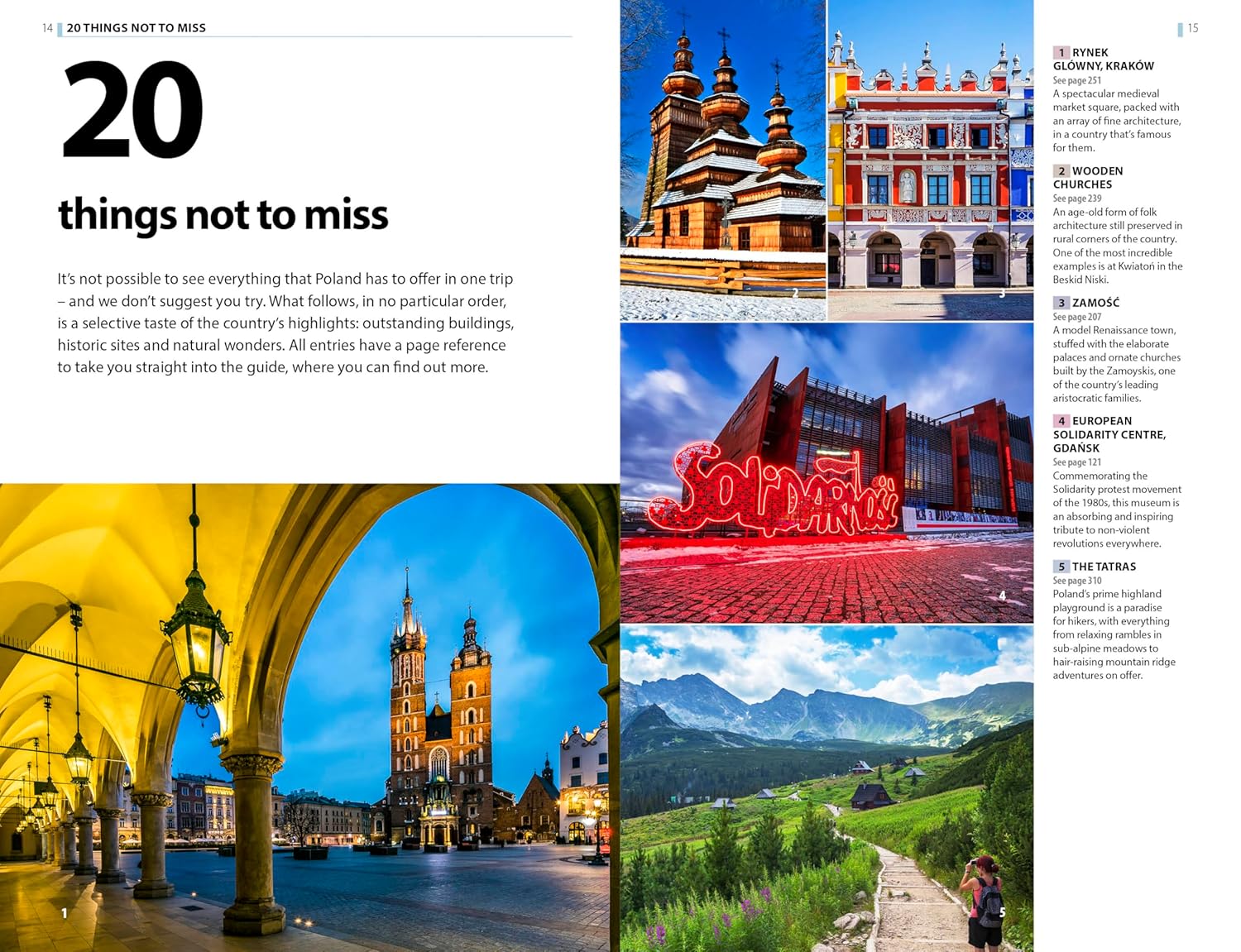 Regional deep dive – coverage of key regions, offering a rich selection of places and experiences, and honest reviews of each oneItinerary samples – designed for various durations and interestsPractical information – tips on how to get there and get around, use public transport, beat the crowds, save time and money, travel responsibly and moreExpert recommendations – insider advice on where to eat, drink, and stay, alongside tips for nightlife and outdoor activitiesSeasonal tips – when to go to Poland, climate details, and festival highlights to plan your perfect tripMust-See pick – a curated selection of not-to-miss sights as chosen by our authors – Rynek Glówny in Kraków, Wooden churches, Zamość, European Solidarity Centre in Gdańsk, Tatras mountains, Wawel, Lublin, The Bieszczady, Warsaw Citadel, Kazimierz Dolny, Słowiński National Park, Katowice, Wrocław, Książ, Auschwitz-BirkenauNavigational maps – colour-coded maps highlighting essential spots for dining, accommodation, shopping and entertainmentCultural insights – engaging stories delve into the local culture, history, arts and more, enriching your understanding of PolandLanguage essentials – a handy Polish dictionary and glossary to help you communicate and connect with localsInspiring travel photography – full-colour pictures capture the essence of Poland, bringing each location to life and fuelling your wanderlustBonus eBook – Free download with purchase, offering digital access to our comprehensive guideCoverage includes: Warsaw, Łódź and central Poland, Gdańsk and the Vistula Delta, Mazuria and Podlasie, Lublin, Polish Carpathians, Kraków and Małopolska, Podhale, the Tatras and the Pieniny, Upper Silesia, Lower Silesia, Wielkopolska, Pomerania