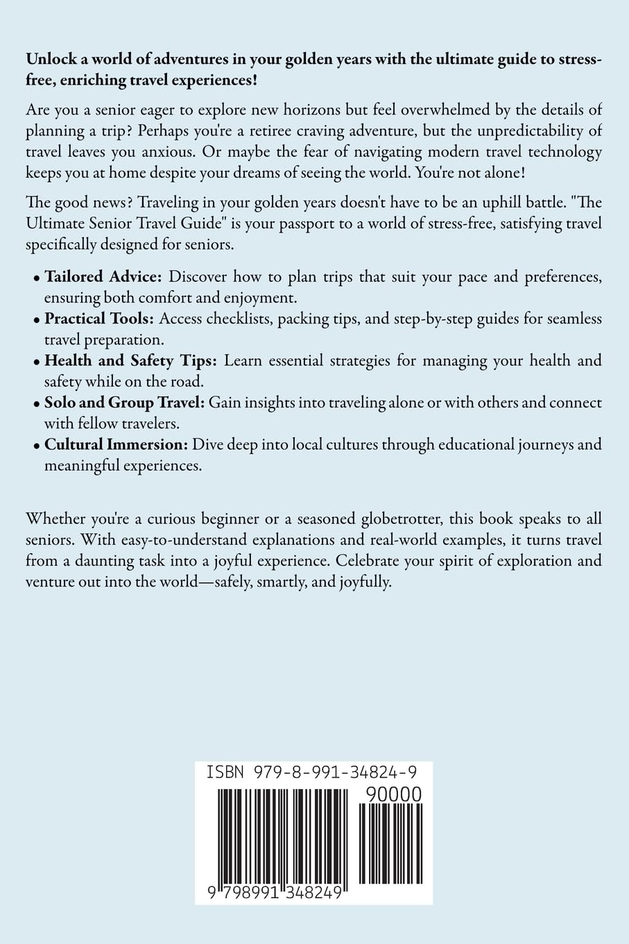 Whether you’re a curious beginner or a seasoned globetrotter, this book speaks to all seniors. With easy-to-understand explanations and real-world examples, it turns travel from a daunting task into a joyful experience. Celebrate your spirit of exploration and venture out into the world-safely, smartly, and joyfully.