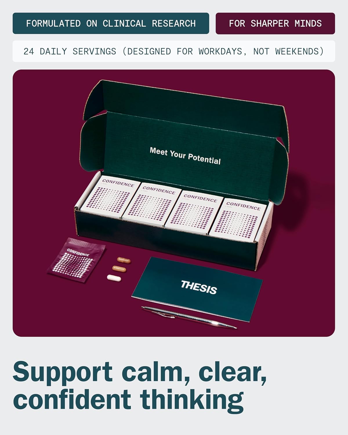 ENCOURAGE EMOTIONAL BALANCE: Thesis Confidence is a cognitive supplement that promotes steadiness and balance. It supports a composed, adaptable outlook while easing occasional nervousness, encouraging calm focus for clear thinking on stressful days.