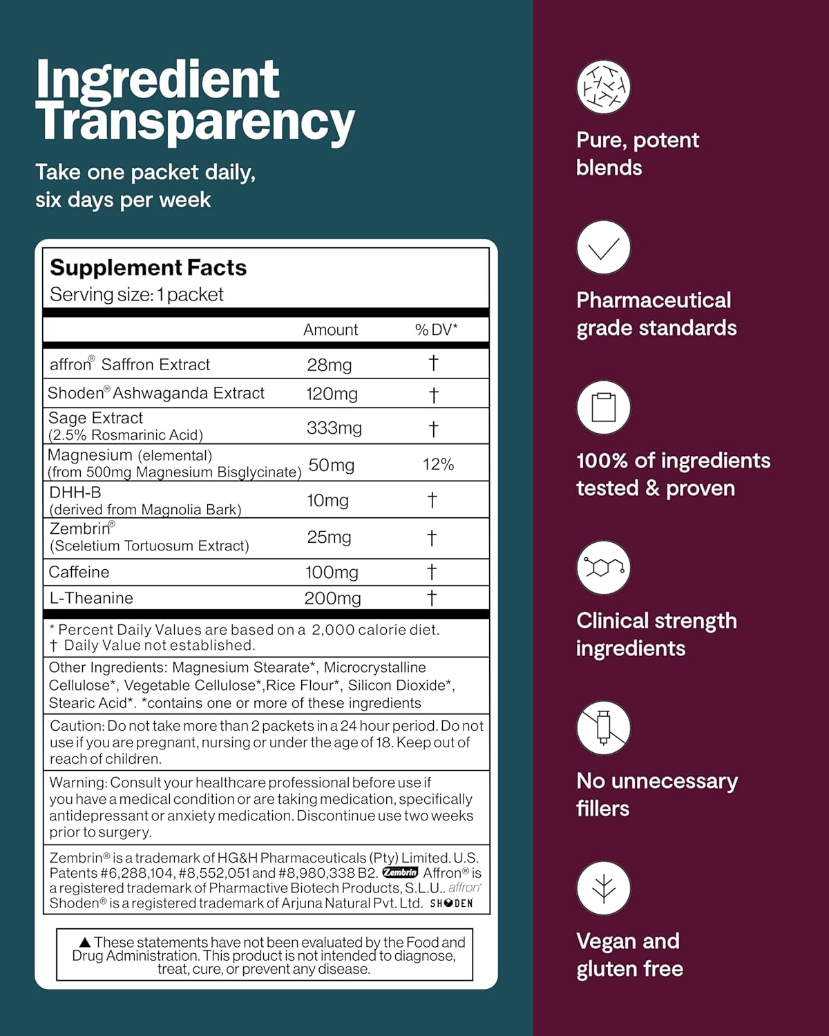 TARGETED INGREDIENT BLEND: Featuring Zembrin, Shoden Ashwagandha, Magnesium, Sage, and DHH-B, which work together to encourage calm, ease tension and support clarity and focus. Includes an optional caffeine capsule for a personalized experience.