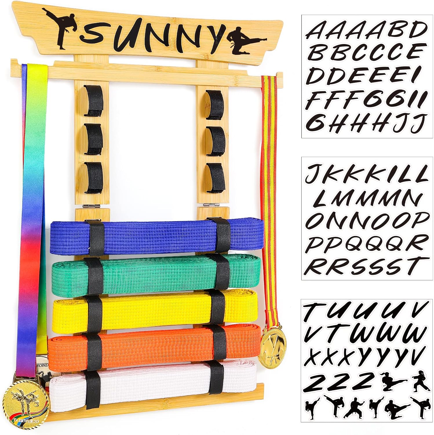 Tilhumt 8 Belt Karate Belt Display Rack with Medal Hanger and Stickers, Taekwondo Belt Display Holder, Martial Arts Belt Display Organizer for Adults, No Assembly Required (Bamboo/Acrylic)