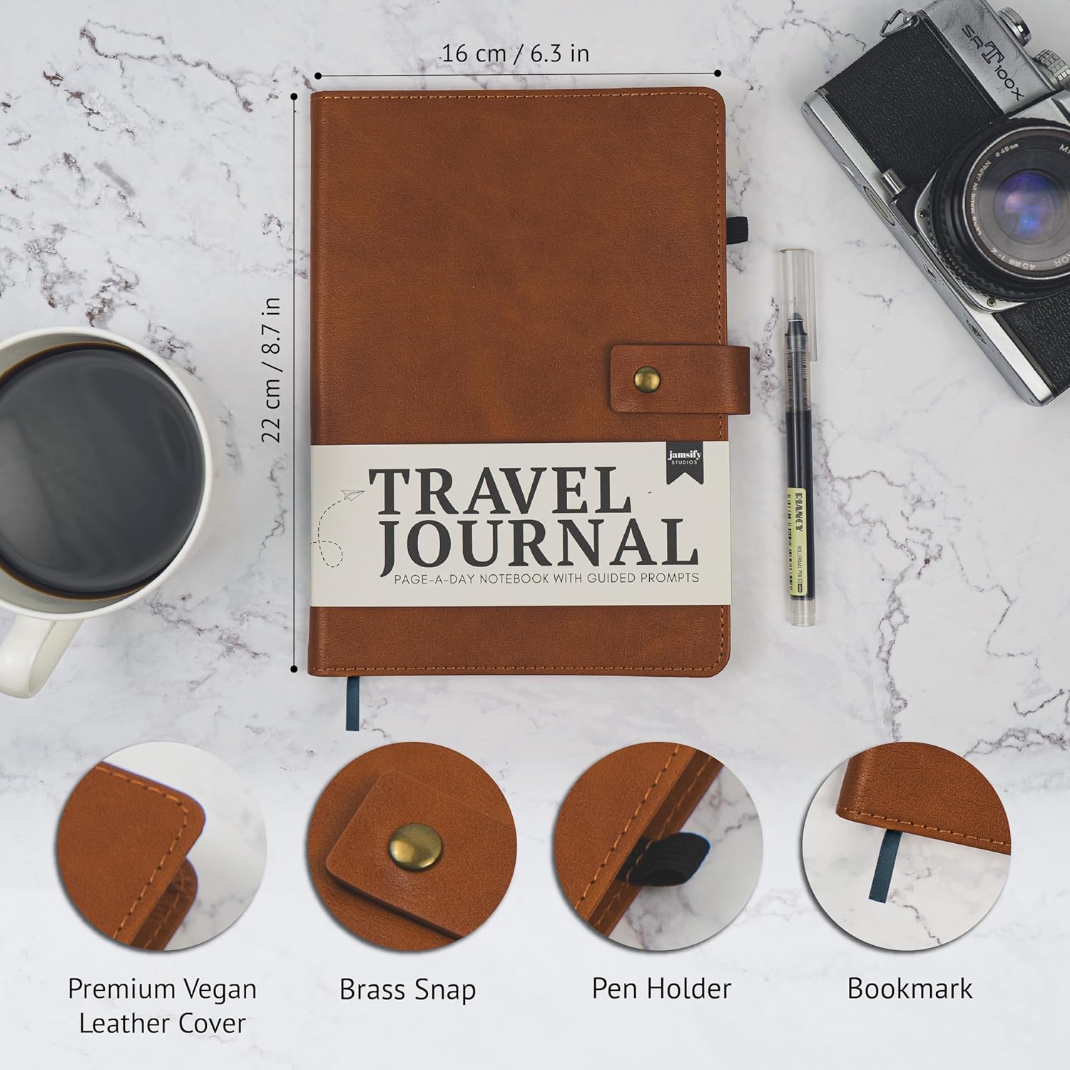 Cover Premium Vegan Leather Journal Type Travel Diary Key Features Pen Holder, Pocket for Keepsakes, Brass Snap Ink Type Soy-Based Ink Size Inner Pages are A5 Paper 100% Recycled Paper Page Count 100 Pages Publisher Jamsify Studios Style Name Explorer
