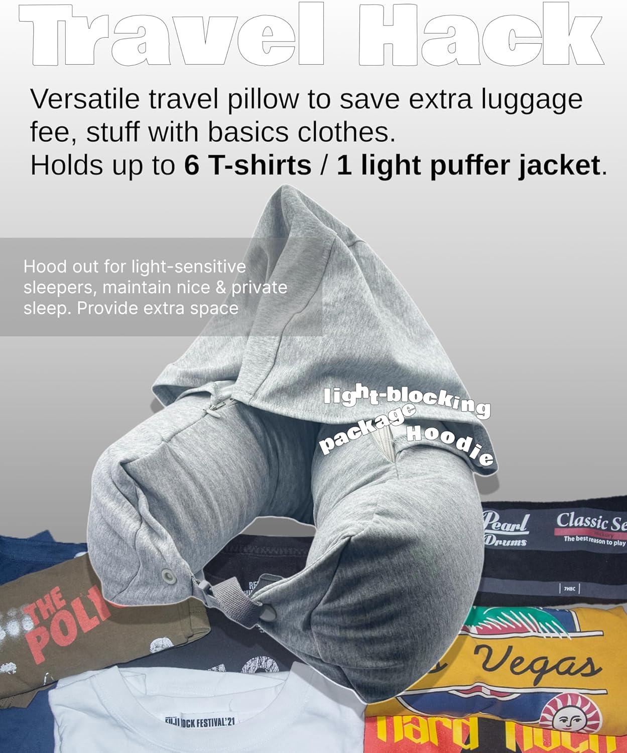 EXTRA LUGGAGE CAPACITY: Easily stuff the pillow with clothes to transform it into additional luggage, avoid overweight trouble, perfect for savvy travelers. Stuffable up to 6 T-shirts, or even a puff-jacket and several socks.