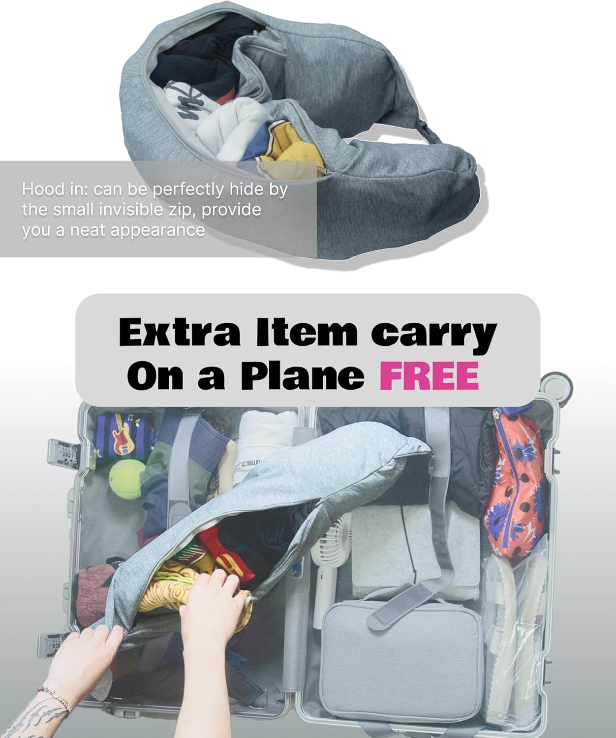 ALL-IN-ONE TRAVEL SOLUTION: The RakuPuff Travel Pillow with built-in hoodie for neck and head support offers comfort and convenience for long flights especially international trips.