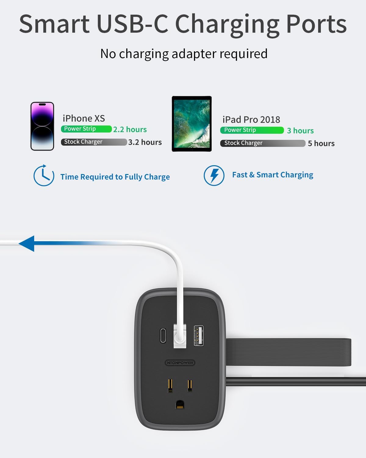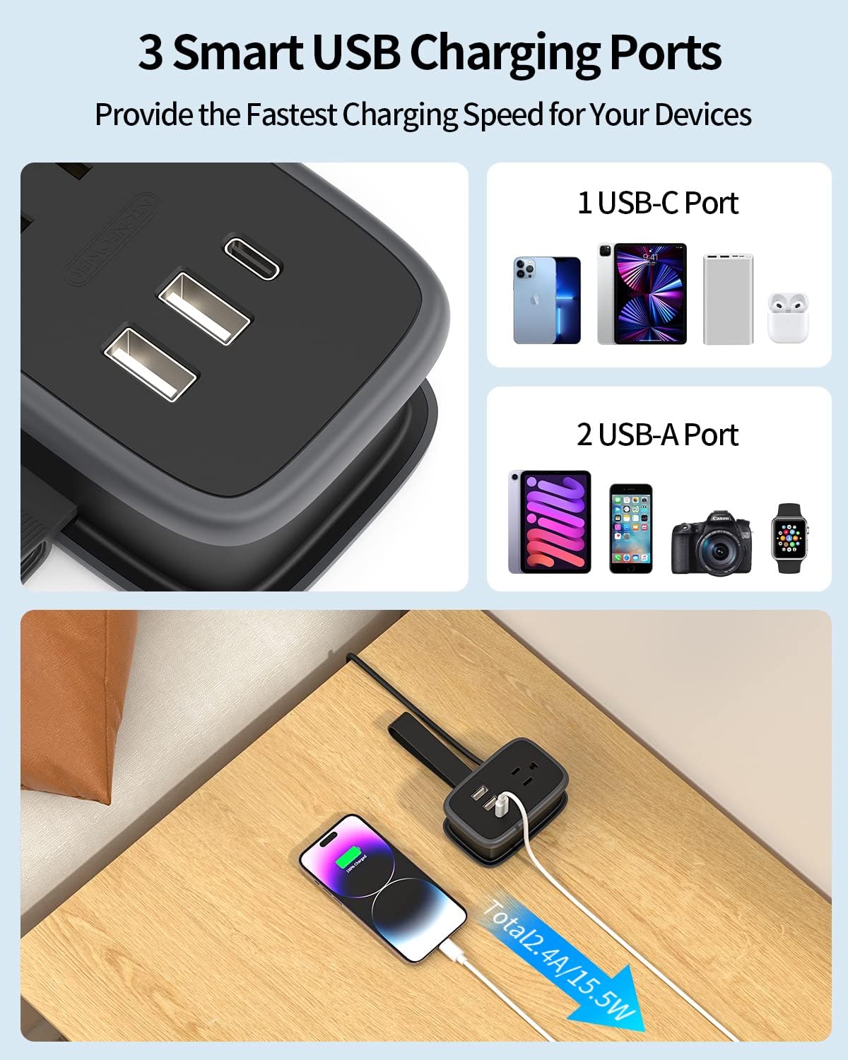 This mini power strip with 2 AC outlets and 2 USB-A 1 USB-C ports can charge 5 electrical devices simultaneously.