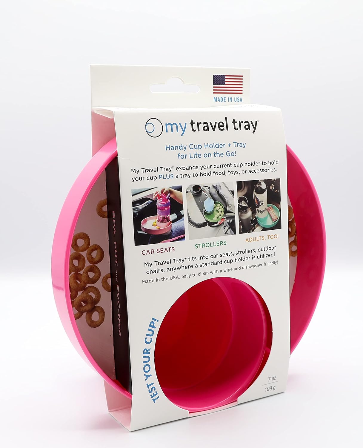 MY TRAVEL TRAY PATENTED DESIGN: Our exclusive patented design makes using it very easy, slip into any standard cup holder and your snack and drink. Complimentary cup adapter and “Grippi” included to allow for additional adaptation and use in endless cup holders.