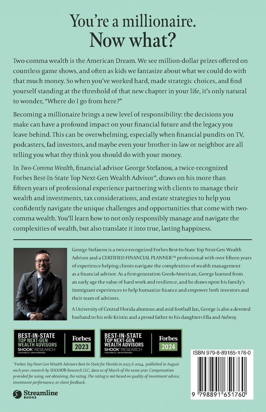 In Two-Comma Wealth, financial advisor George Stefanou, a twice-recognized Forbes Best-In-State Top Next-Gen Wealth Advisor*, draws on his more than fifteen years of professional experience partnering with clients to manage their wealth and investments, tax considerations, and estate strategies to help you confidently navigate the unique challenges and opportunities that come with two-comma wealth. You’ll learn how to not only responsibly manage and navigate the complexities of wealth, but also translate it into true, lasting happiness.