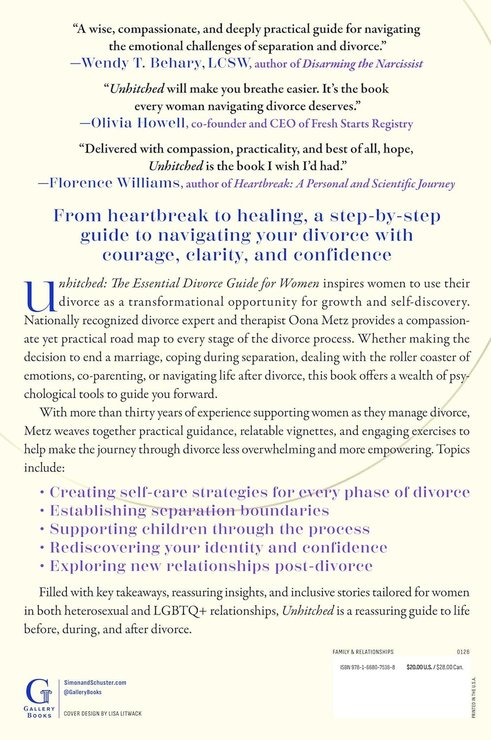 Unhitched inspires women to use their divorce as a transformational opportunity for growth and self-discovery. Nationally recognized divorce expert and therapist Oona Metz provides a compassionate yet practical roadmap through every stage of the divorce process. Whether making the decision to end a marriage, coping during separation, dealing with the rollercoaster of emotions, coparenting, or navigating life after divorce, this book offers a wealth of psychological tools to guide you forward.