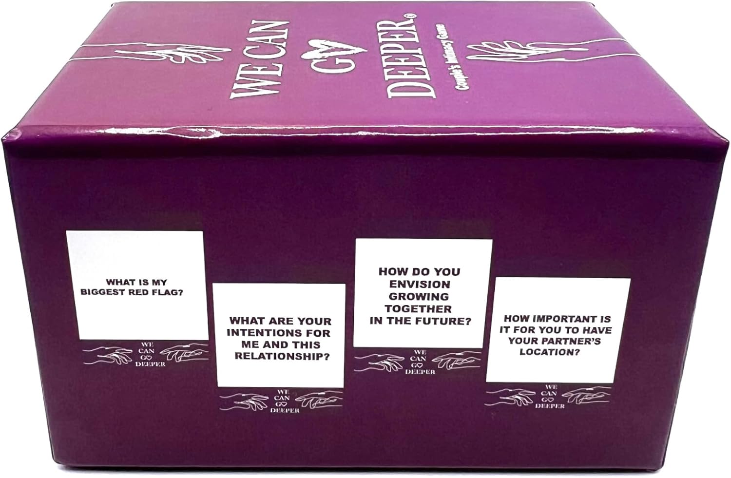 Welcome to We Can Go Deeper: Couple’s Intimacy Game. This conversation card game aims to challenge you and your special someone to have deeper, more intimate conversations by asking each other things that have either been avoided in the past or only lightly touched on. It is meant to be a challenging experience but not in a devisive way. It is meant to challenge you into a deeper frame of thought that leads to an even stronger connection. You’ll hopefully learn more about yourself as well as all of your past experiences!
