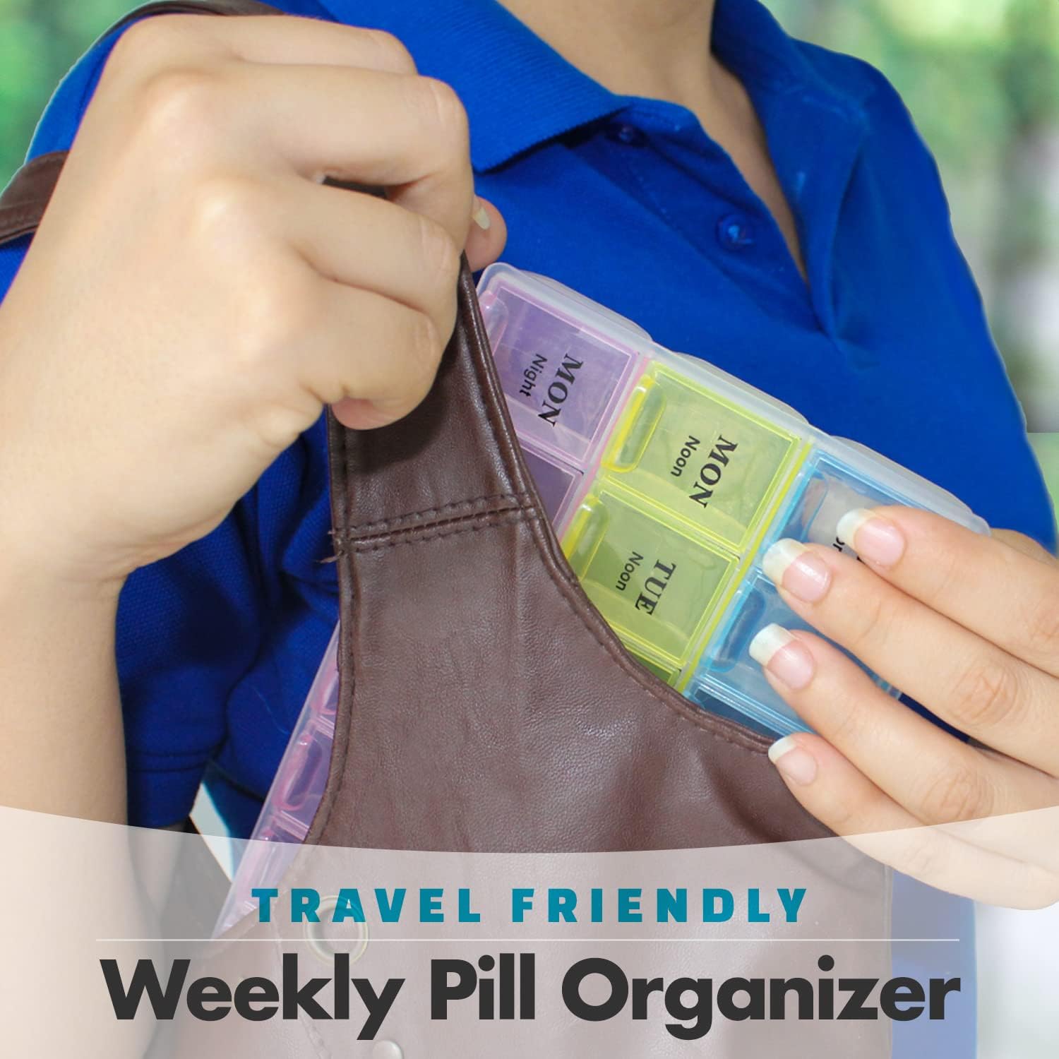 EXCEPTIONAL DESIGN: The pill organizer has a contoured design for easy pill removal. It includes 21 large compartments and lets you store medicines in bulk. The box comes in bright and attractive colors.