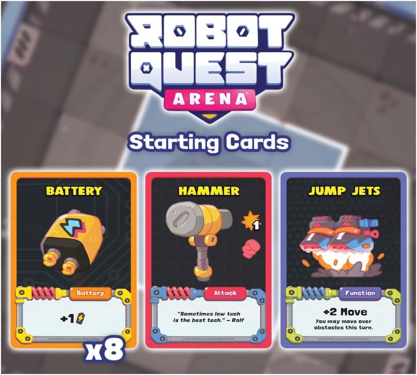 Robot Quest Arena is a Deckbuilding Board Game where 2-4 players battle to be the best Robot Tech in the world. Control, protect, and upgrade your bot as you fight to knock out competitors from the arena!