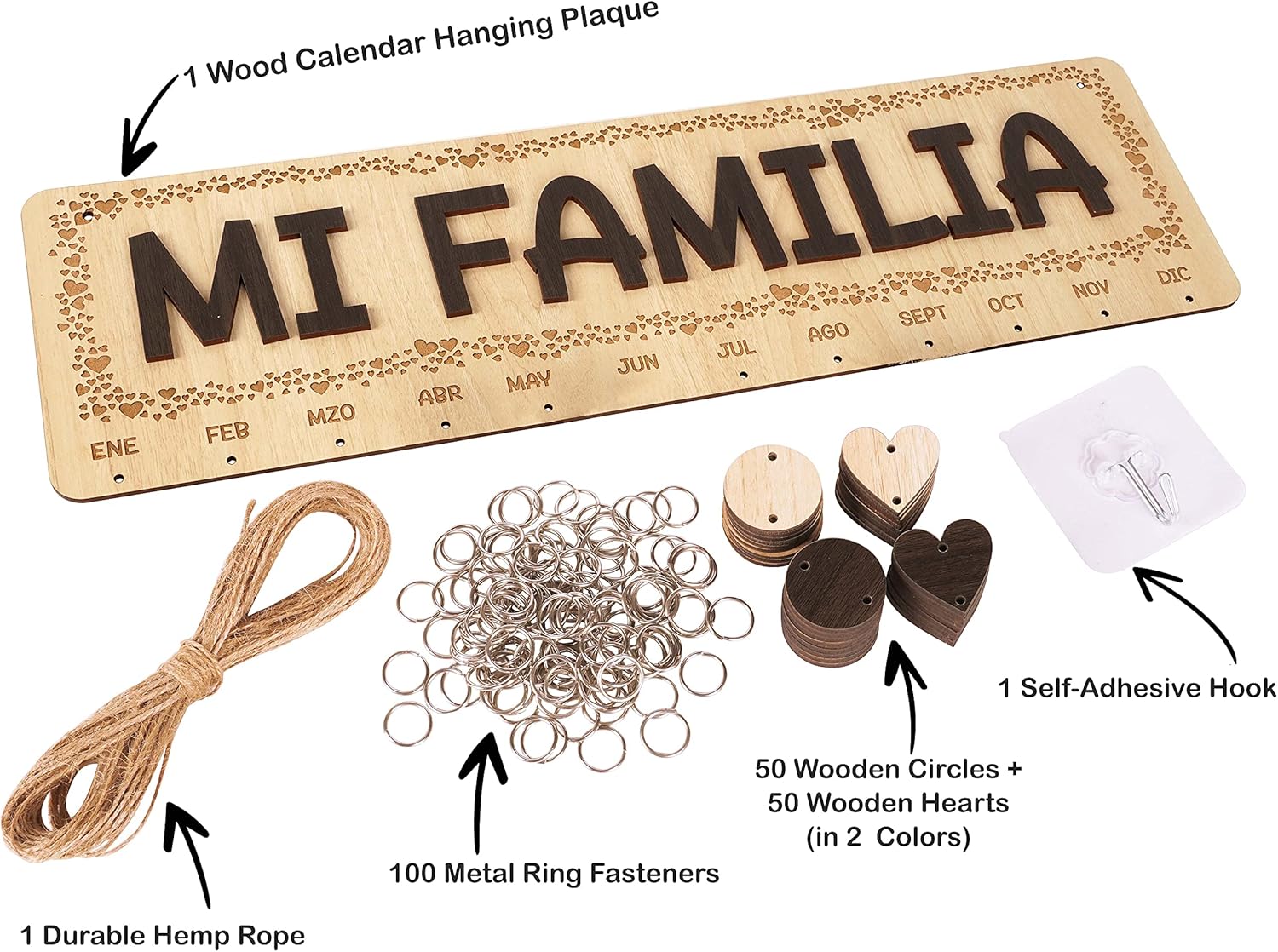✅ WOODEN CALENDAR PLAQUE KIT: Package included 1 x Hanging Wooden Board, 1 x Hemp Rope; 1 x Self-Adhesive Hook; 50 x Round Wooden Slices, 50 x Heart Wooden Slices, 100 x Assembly Hooks.