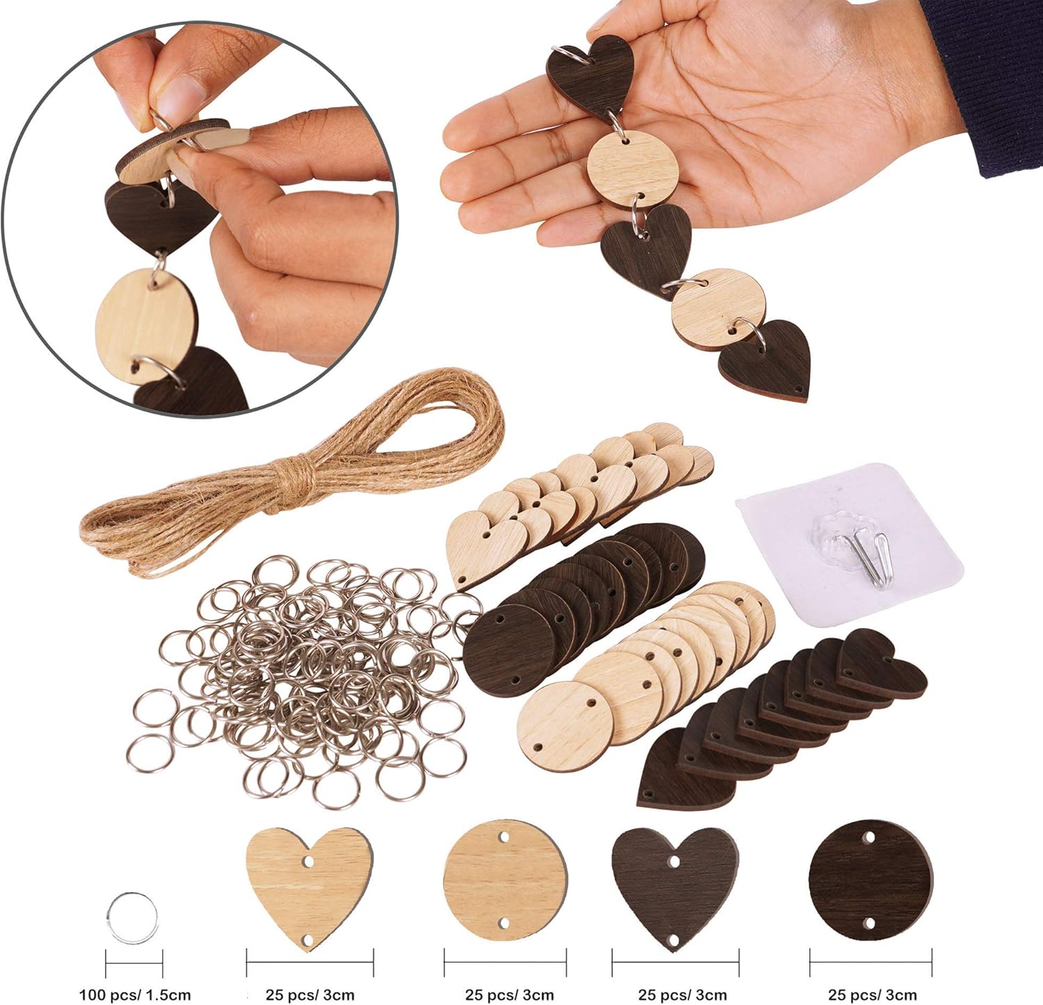 1 x Hanging Wooden Board,1 x Hemp Rope1 x Self-Adhesive Hook50 PC x Round Wooden Slices50 PC x Heart Wooden Slices100 PC x Assembly Hooks.