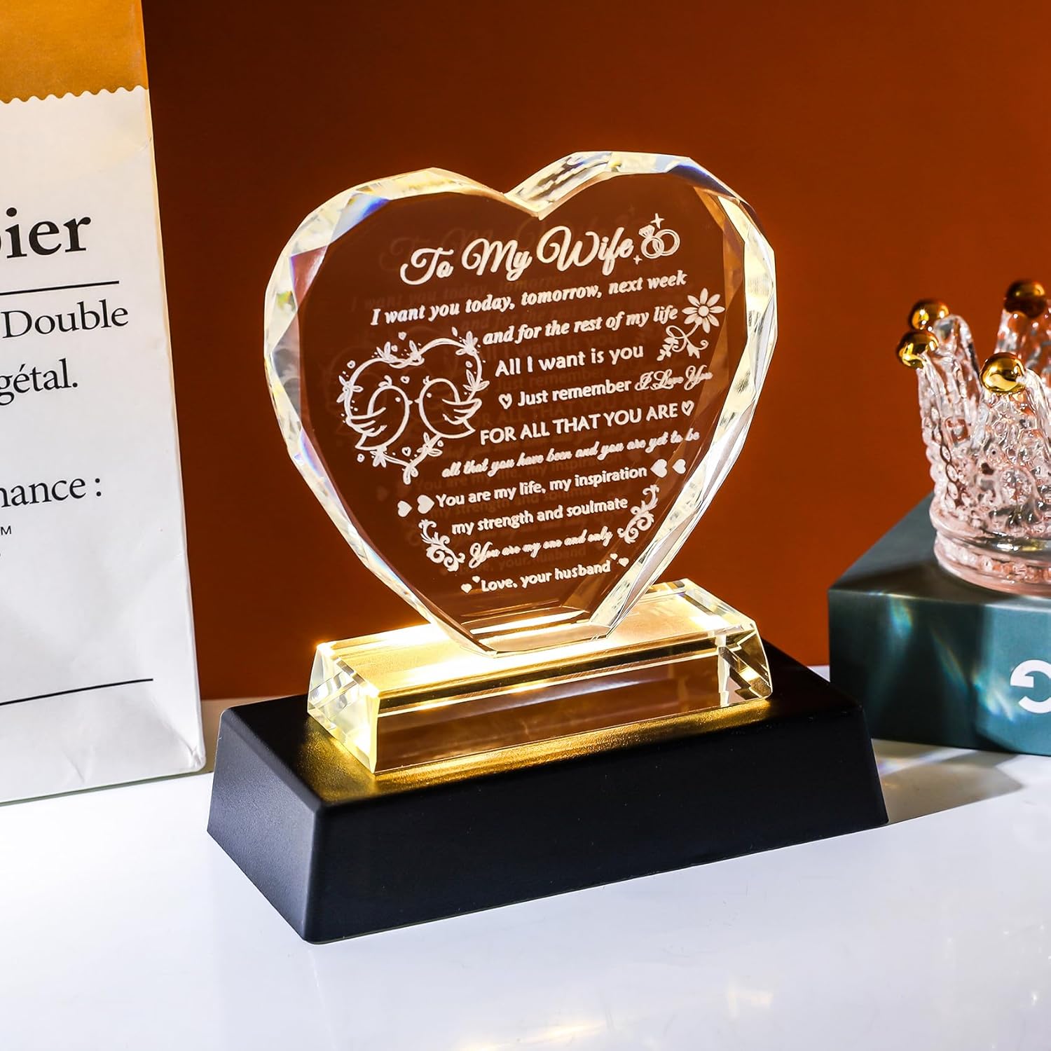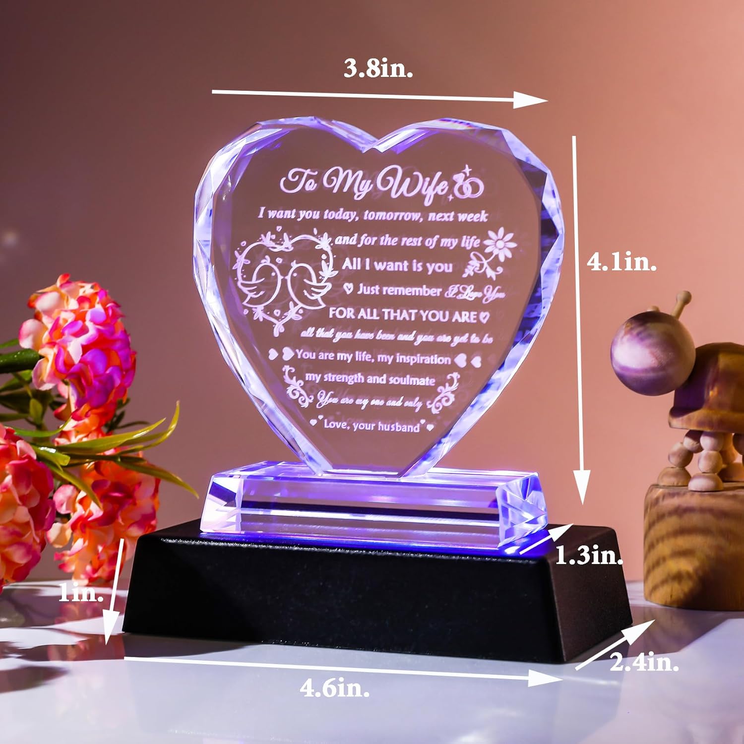 Special Wife Gifts Ideas: The gift for wife is made of k9 crystal, transparent and shiny, the gift is designed in a heart shape, love quotes are engraved inside the crystal by laser, the patterns and words will never fade, express your eternal love to your wife, tell your wife you How much you love her and how much she means to you, your wife will be surprised and happy with the gift