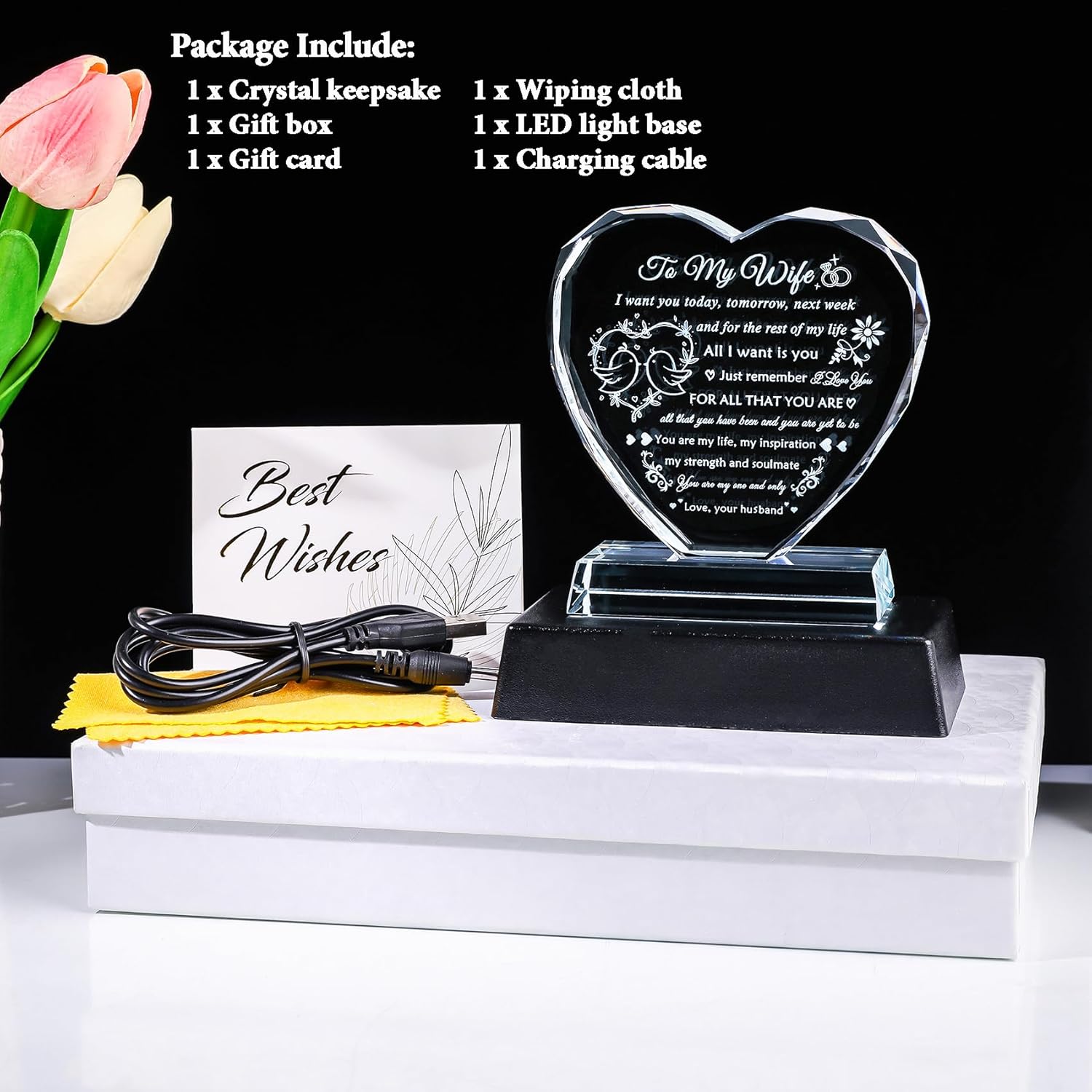 Gift Box Packing: Package includes crystal keepsake, LED light base, charging cable, wiping cloth, blank gift card (you can write whatever you want) and gift box, the gift can be sent directly without repacking