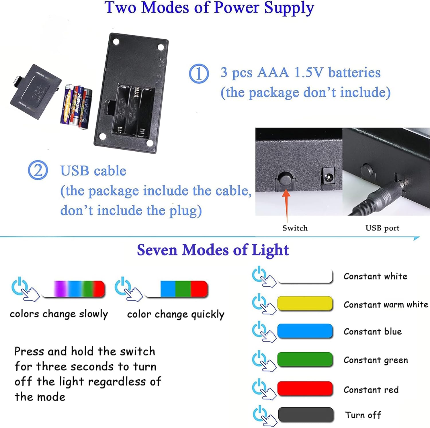 Press the button for the first time, the light will change colors very slowly. Press it again and the light will change colors faster. When the button is pressed for the third time, the light will change color to white and stop changing colors automatically and each time the switch is pressed thereafter, the light will change and stay in one color. The fourth time you press the button, the color of light is red; the fifth time is blue and the sixth time is green. Press it the seventh time, the light will turn off. Press and hold the switch for three seconds to turn off the light regardless of the mode.